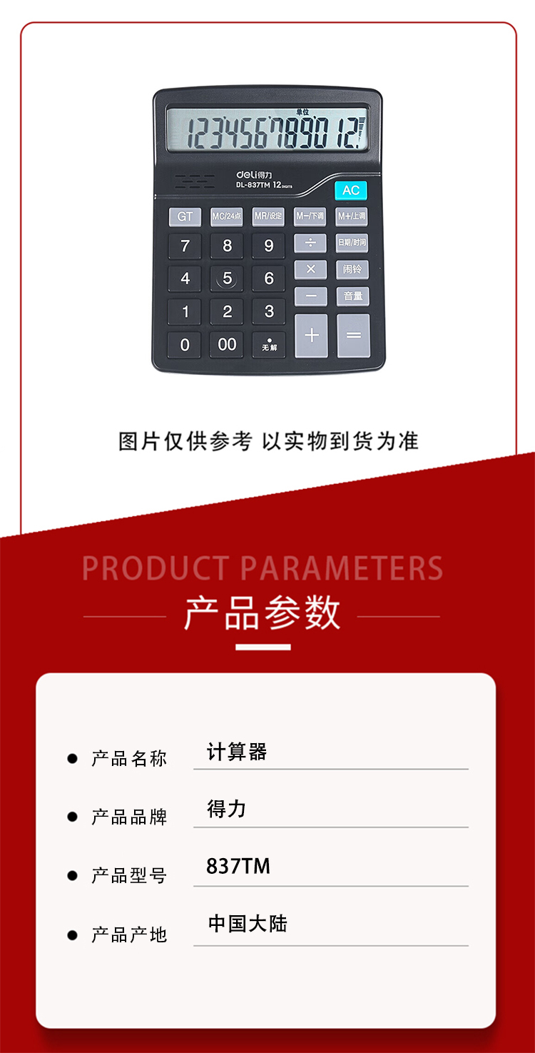 商品名称:得力(deli) 837TM 120*145mm 计算器 黑色(单位:个)