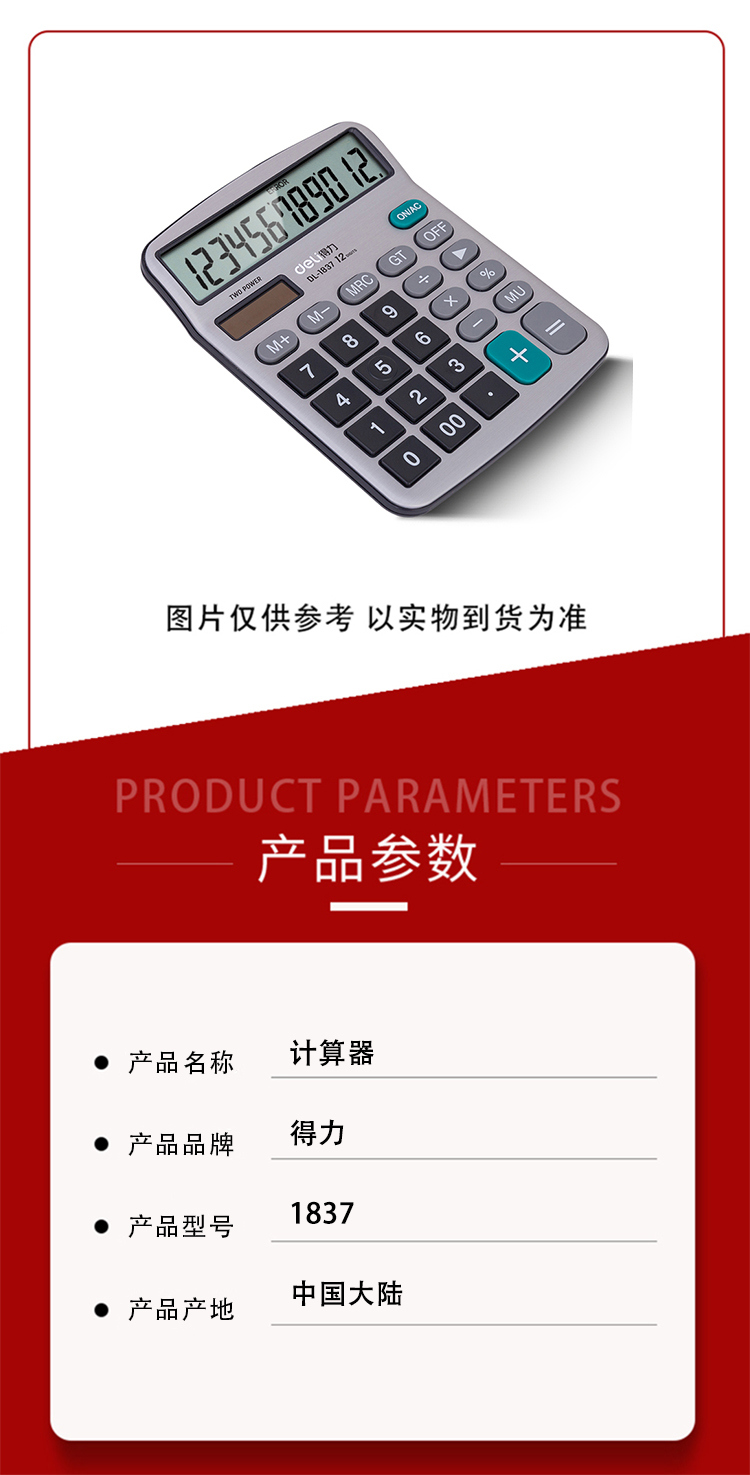 商品名称:得力(deli) 1837 120*152.8mm 计算器 银色金属(单位:个)