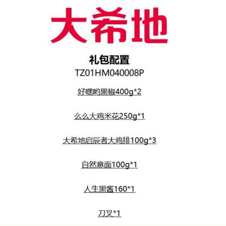 商品名称:【大希地】 牛排/鸡肉/意面欢庆套餐(牛排800g+鸡排300g+鸡米花250g+意面100g+刀叉酱包) TZ01HM040008P