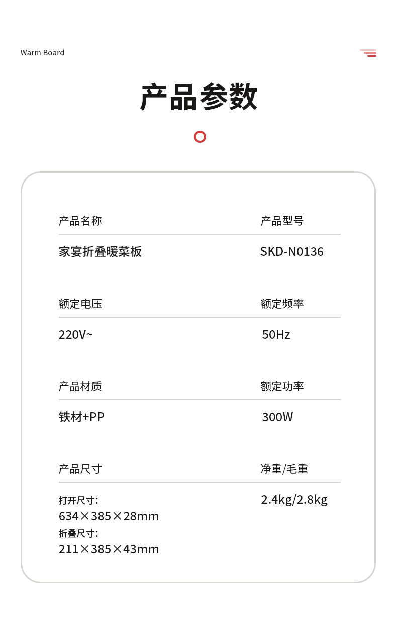 商品名称:思嘉思达 SKD-N0136 220V~ 家宴折叠暖菜板(单位:个)