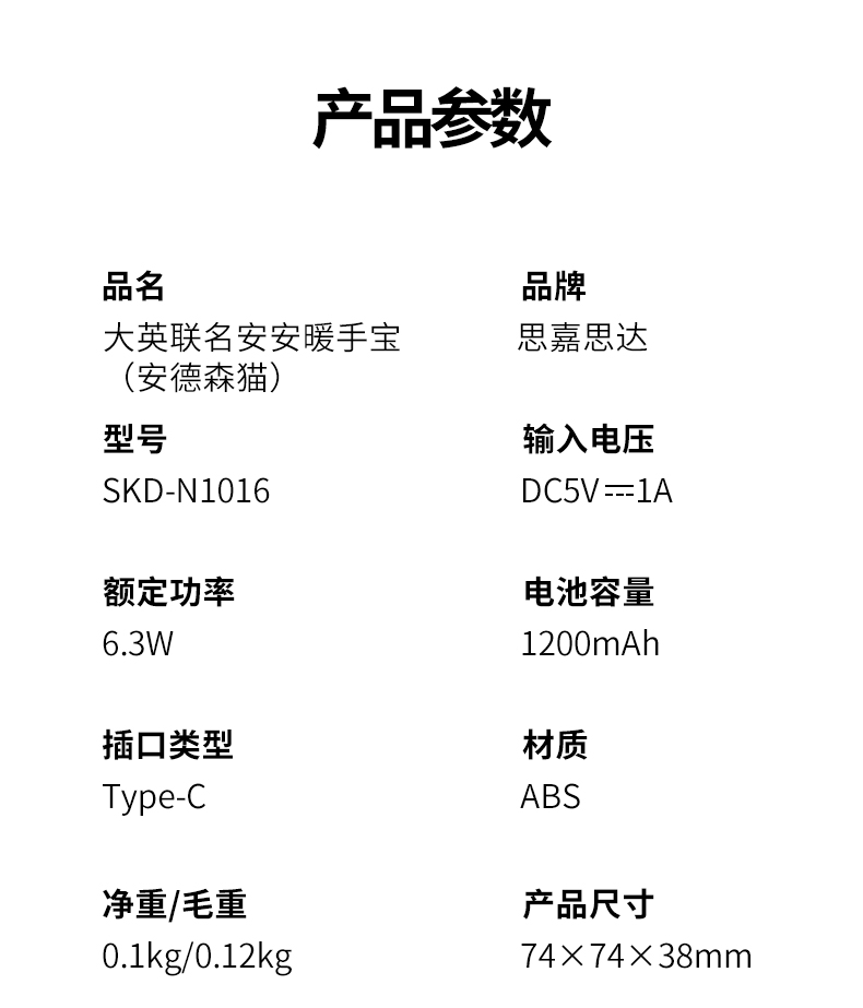 商品名称:思嘉思达 SKD-N1016 6.3W 大英联名安安暖手宝(安德森猫)(单位:个)