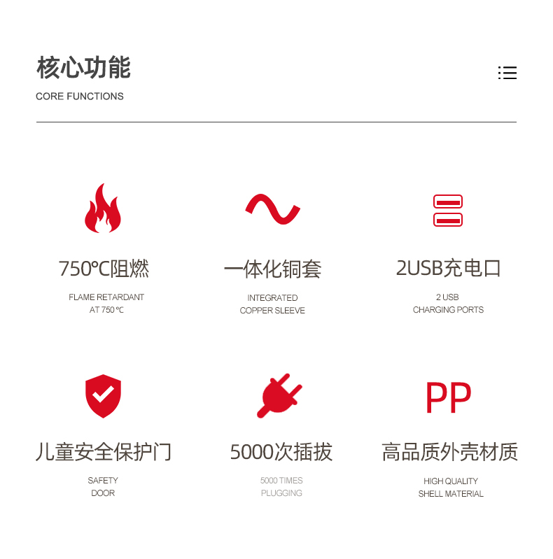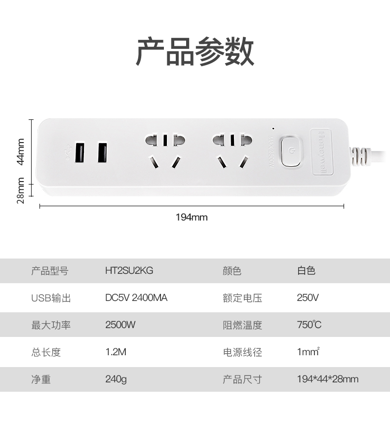 商品名称:霍尼韦尔 HT2SU2KG 2500W 总控开关带USB充电二位五孔延长线插座(1.2M)(单位:个)