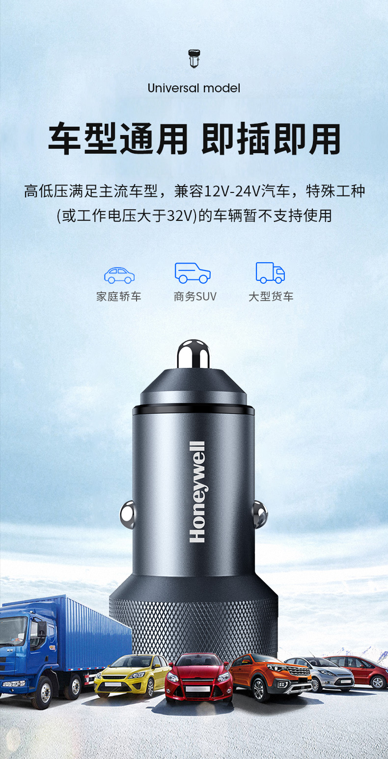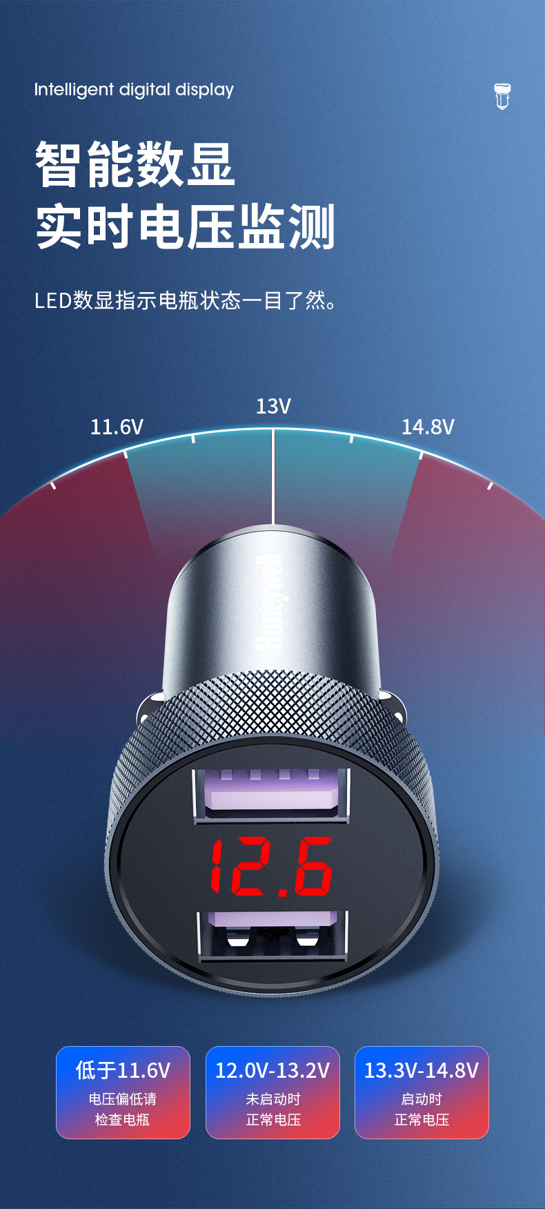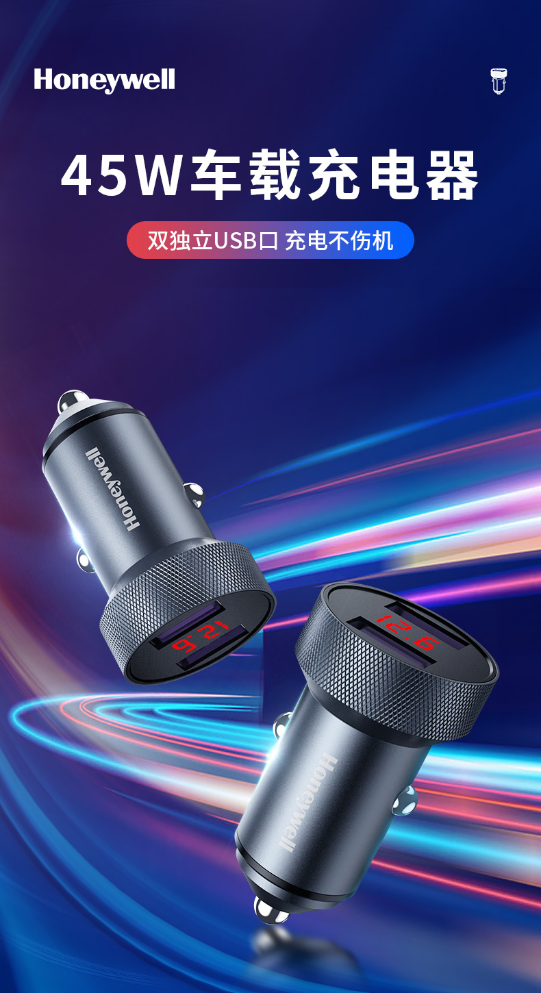 商品名称:霍尼韦尔 HZDS2 21g 数显双独立QC车载充电器(单位:个)