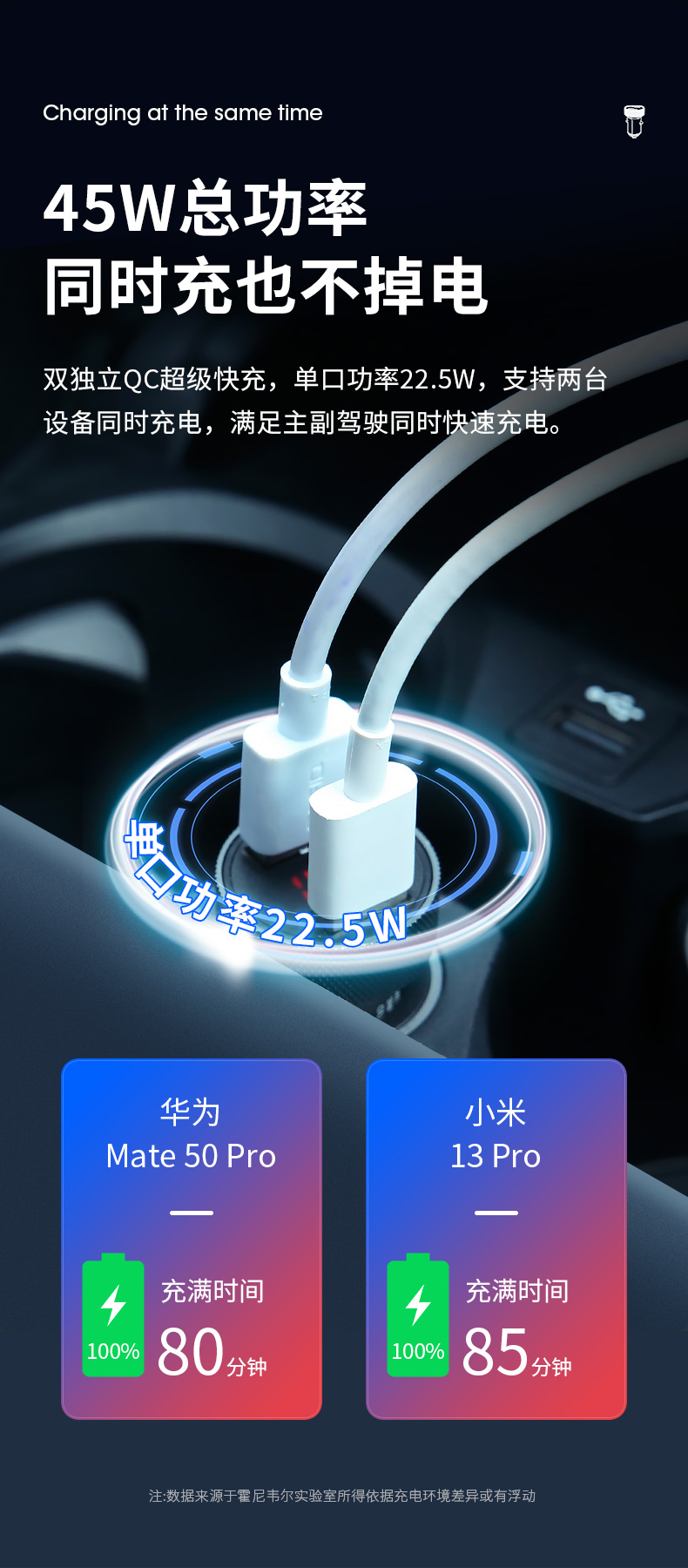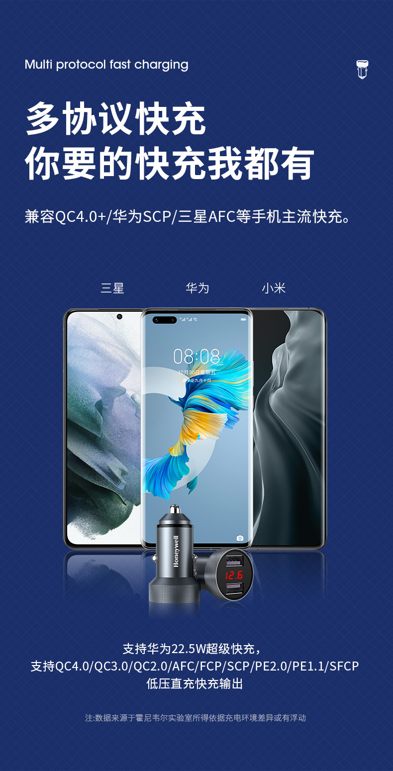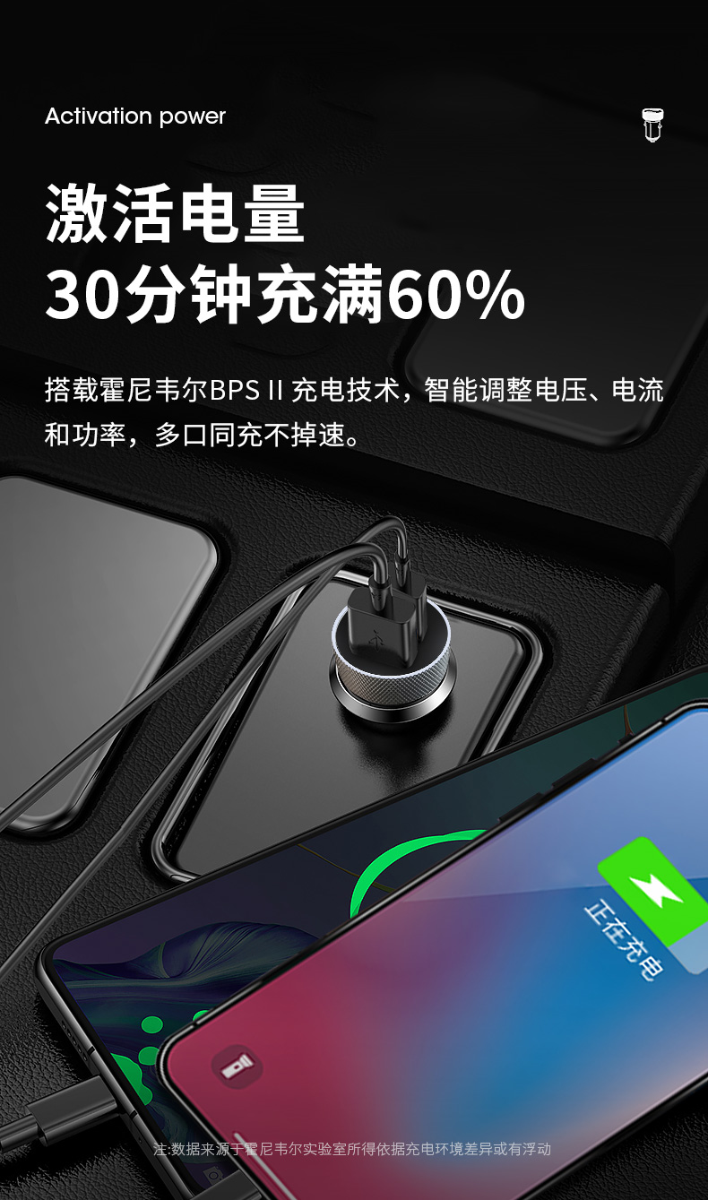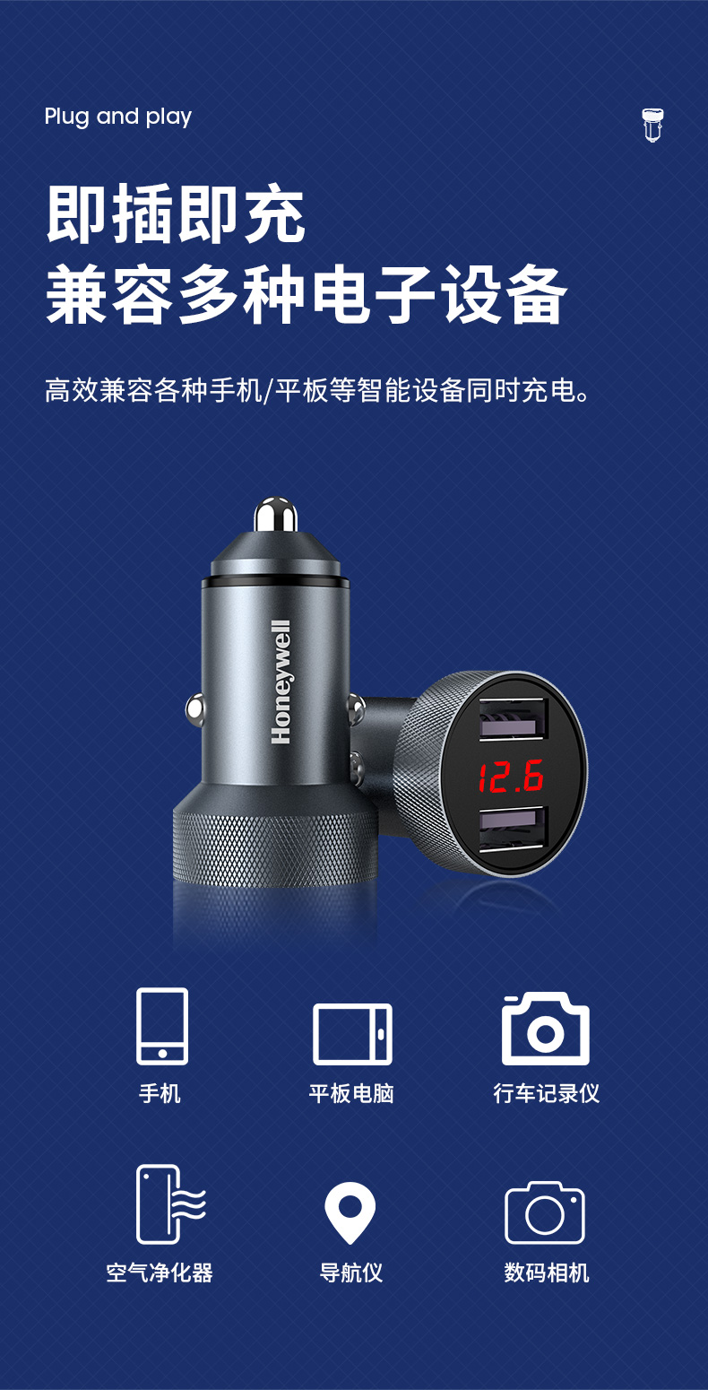 商品名称:霍尼韦尔 HZDS2 21g 数显双独立QC车载充电器(单位:个)