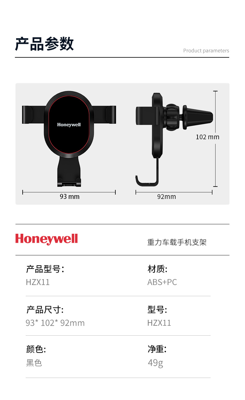 商品名称:霍尼韦尔 HZX11 49g 重力感应自动车载支架(单位:个)