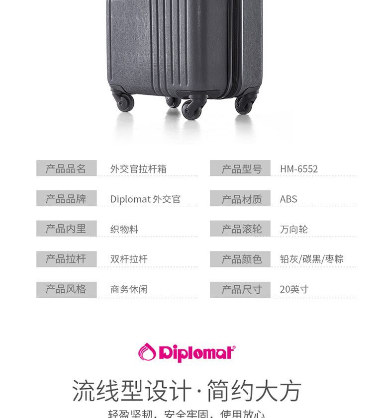 商品名称:外交官 HM-6552 20英寸 拉杆箱 爵士黑色(单位:个)