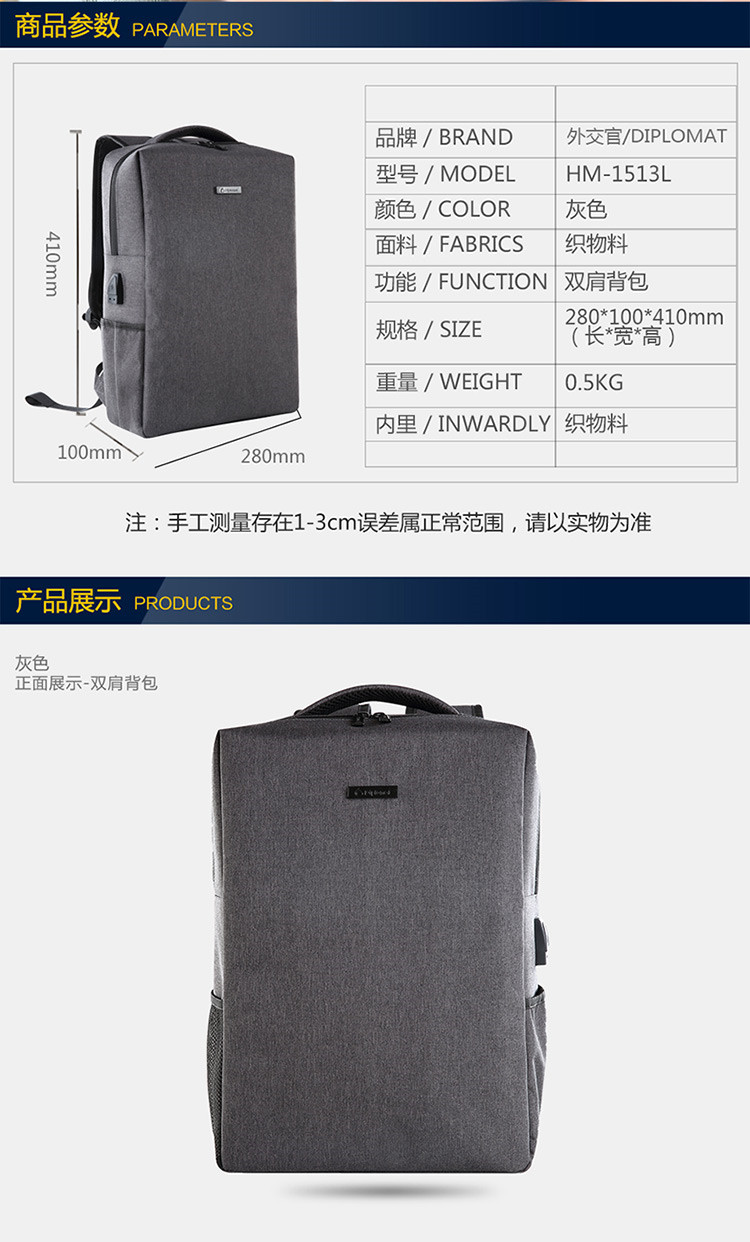 商品名称:外交官 HM-1513L 织物料 双肩包 灰色(单位:个)