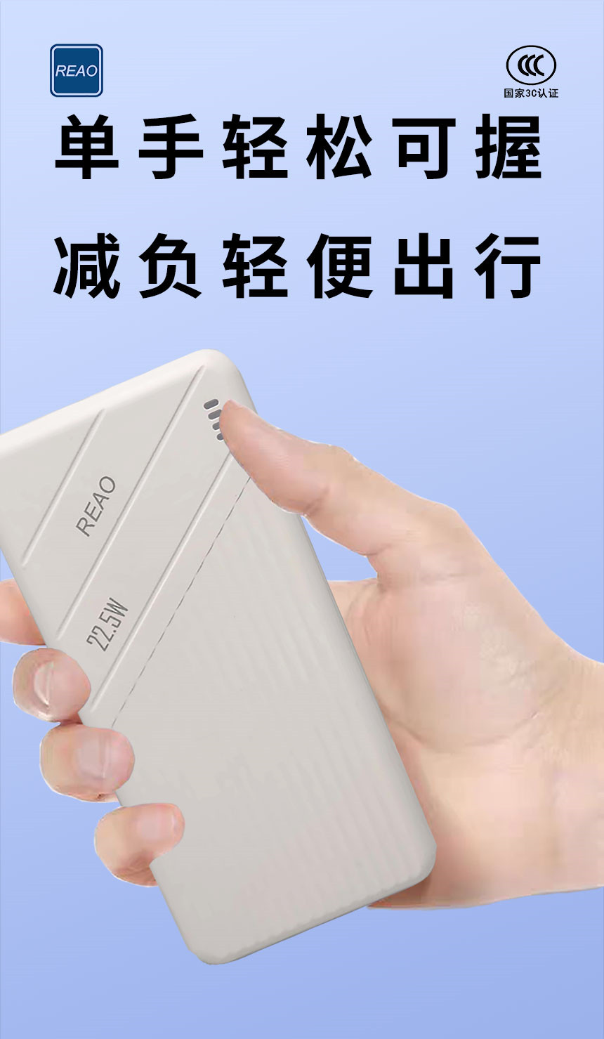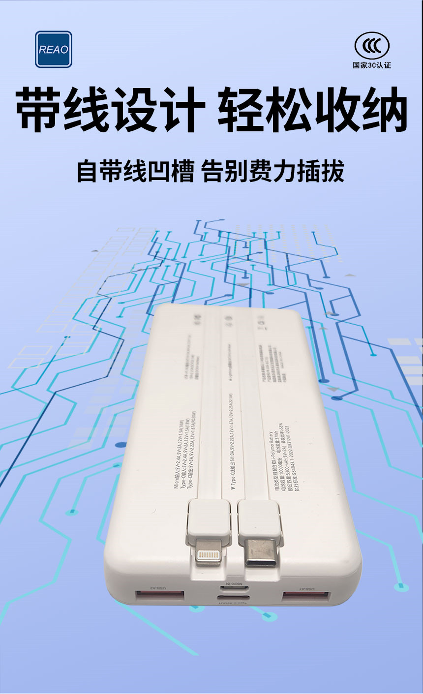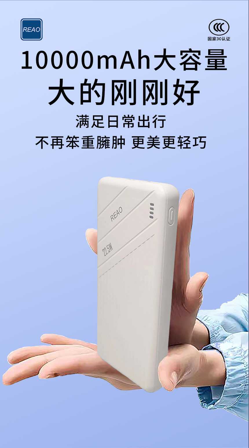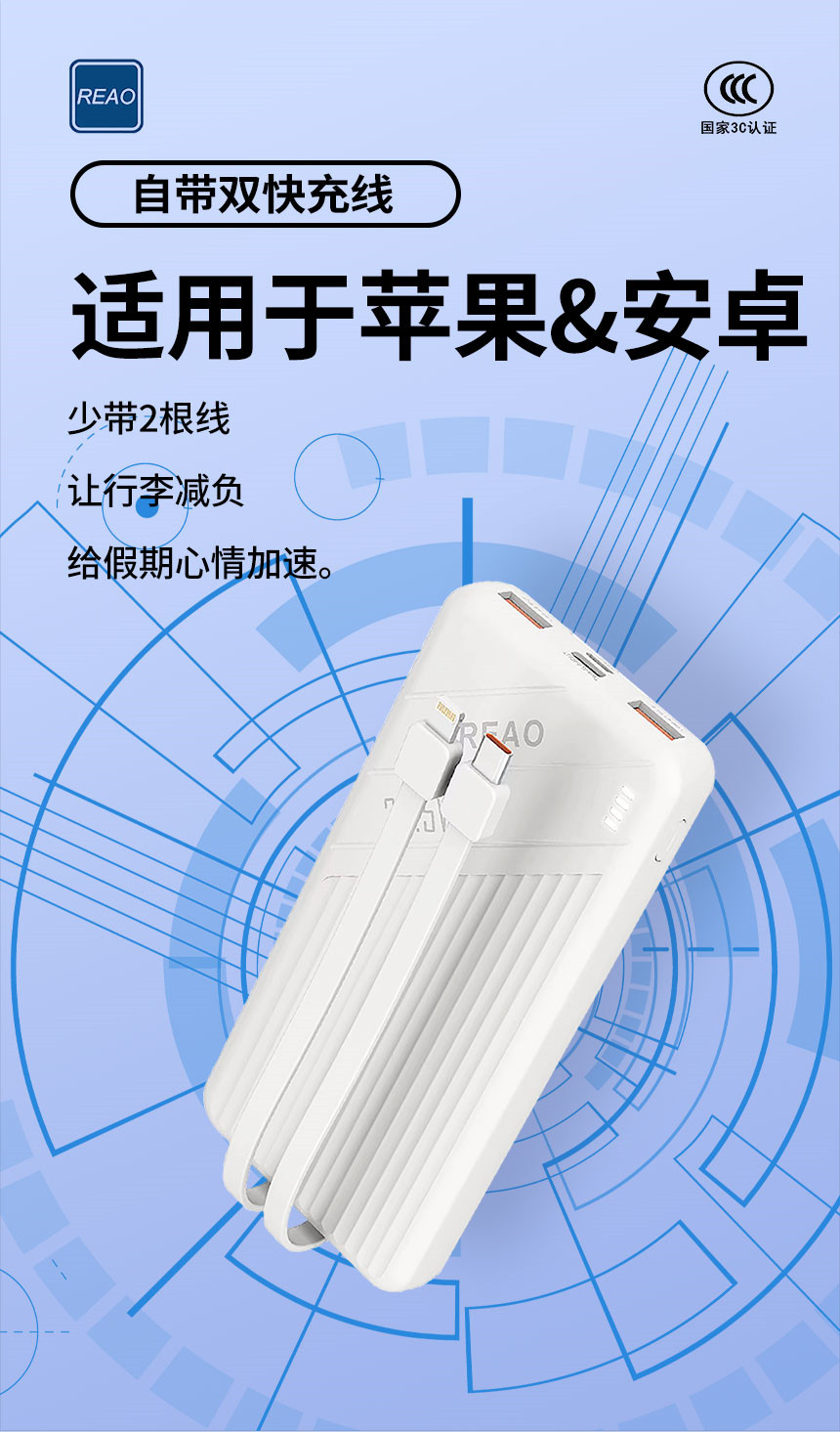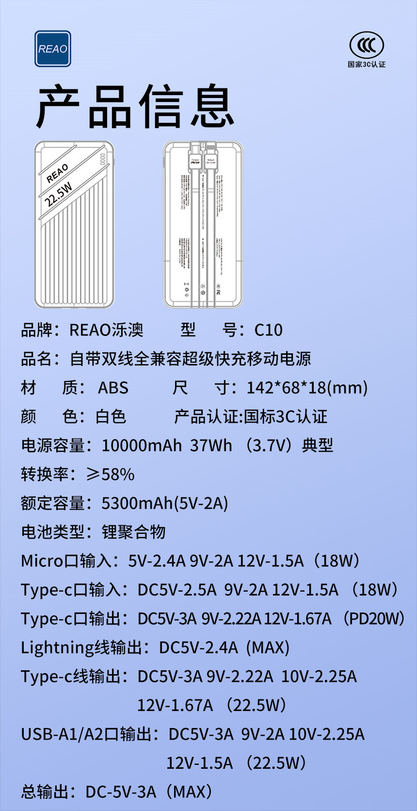商品名称:泺澳(REAO) C10 电源容量:10000mAh 尺寸:142*68*18(mm) 自带线快充移动电源 白色(单位:个)