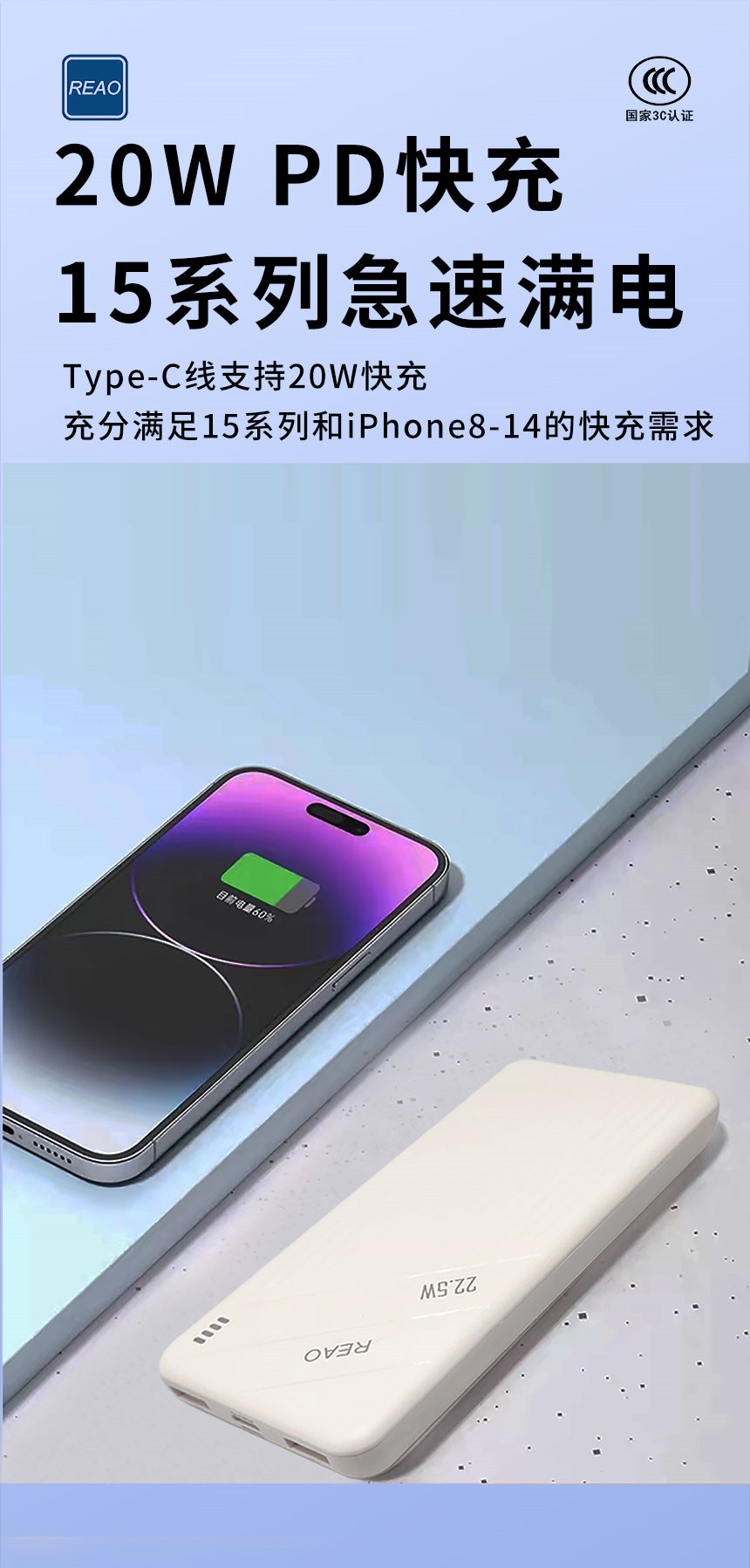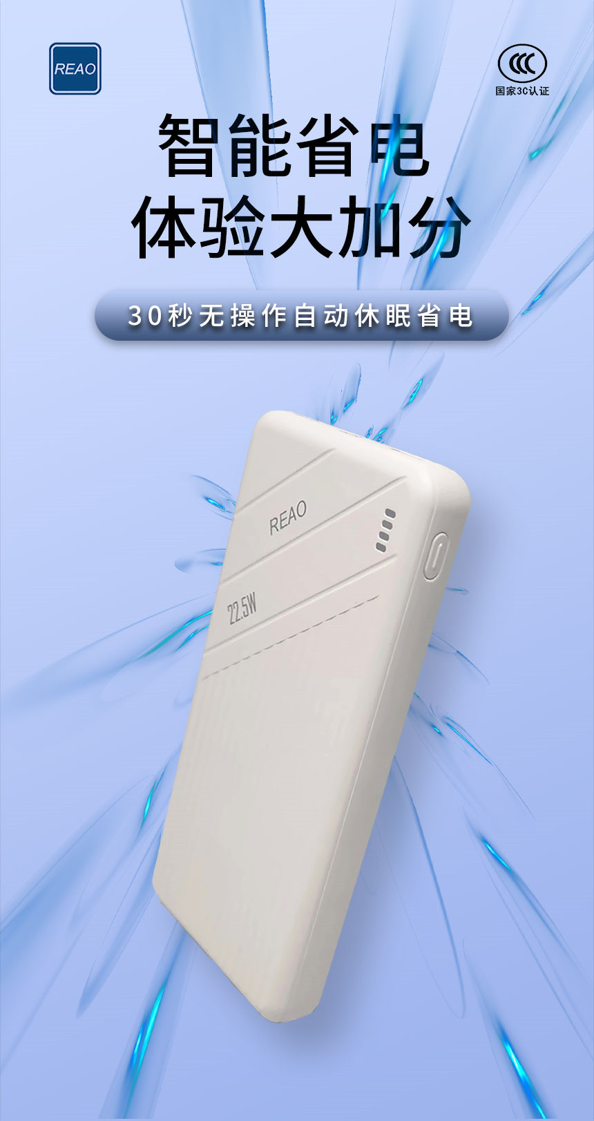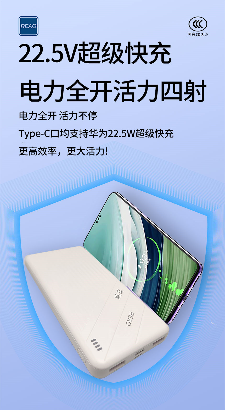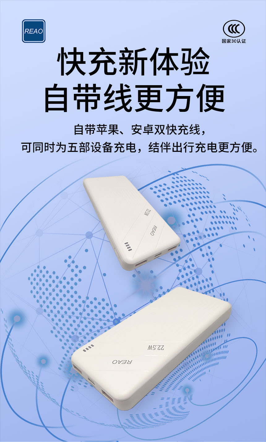 商品名称:泺澳(REAO) C10 电源容量:10000mAh 尺寸:142*68*18(mm) 自带线快充移动电源 白色(单位:个)