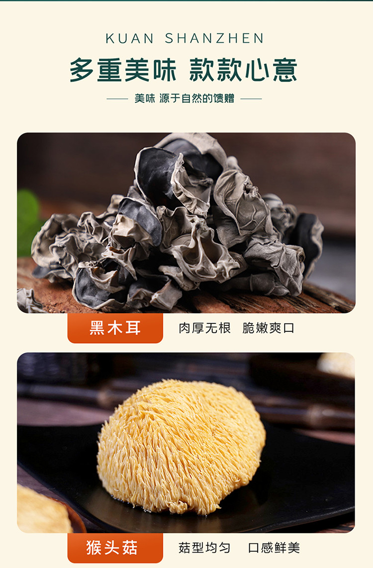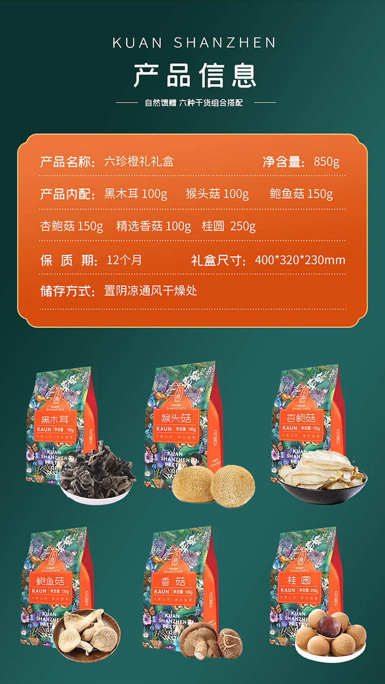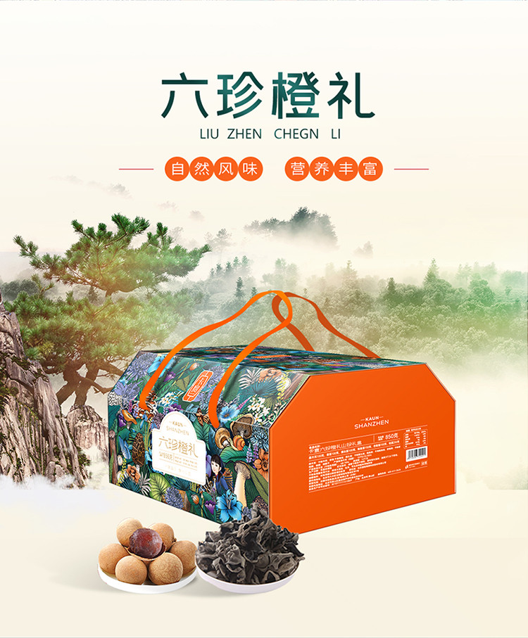 商品名称:卡宴 六珍橙礼 黑木耳100g 猴头菇100g 鲍鱼菇150g 杏鲍菇150g 精选香菇100g 桂圆250g 山珍干货礼盒(单位:盒)