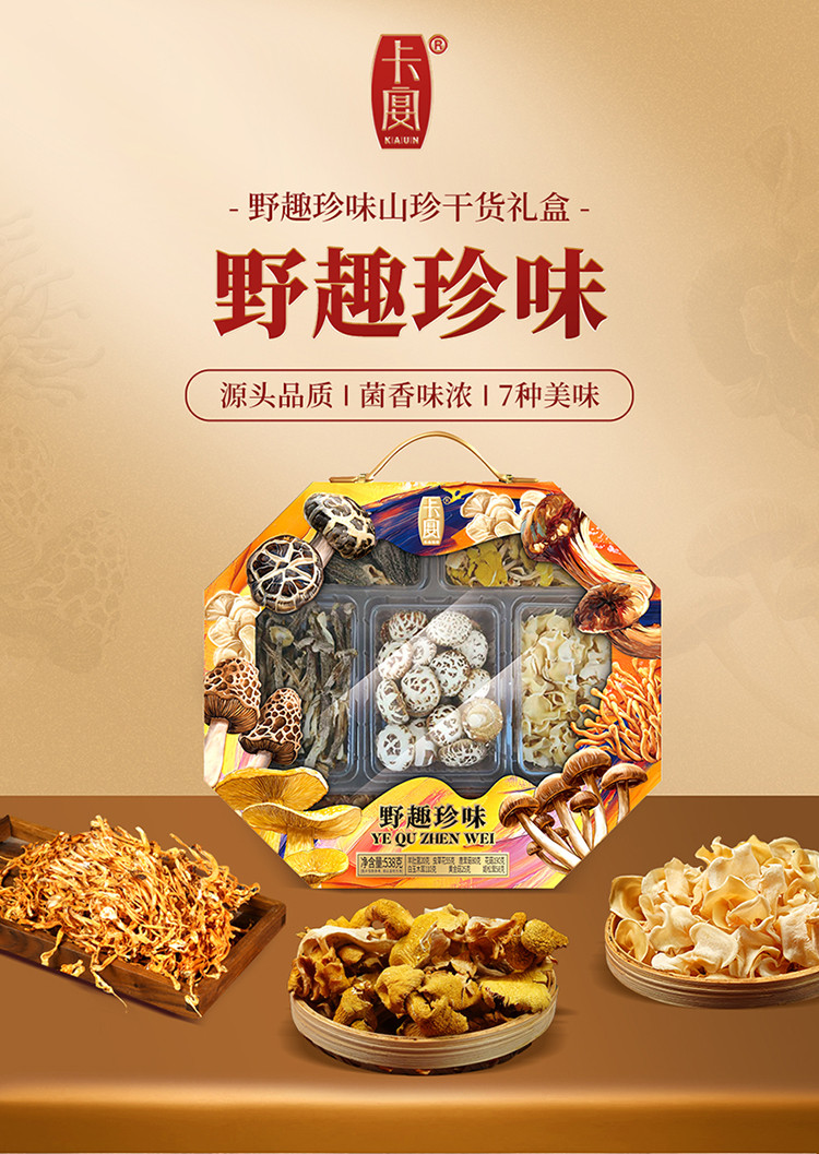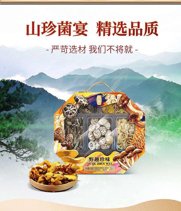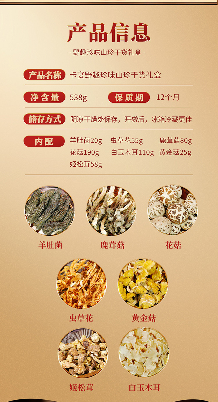 商品名称:卡宴 野趣珍味 羊肚菌20g 虫草花55g 鹿茸菇80g 花菇190g 白玉木耳110g 黄金菇25g 姬松茸58g 山珍干货礼盒(单位:盒)