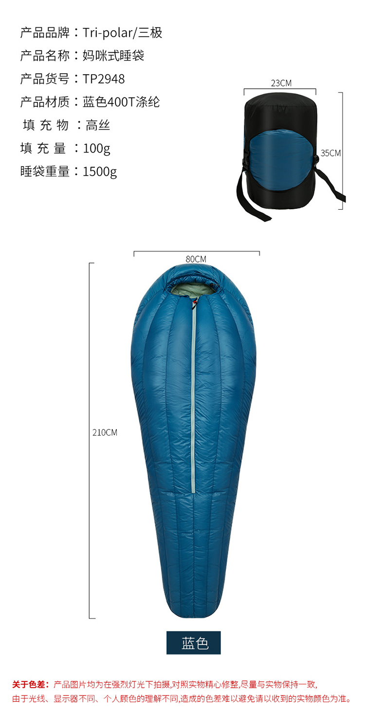商品名称:三极 TP2948 210*80cm填充1000g高丝总重1500g 睡袋 蓝色(单位:条)