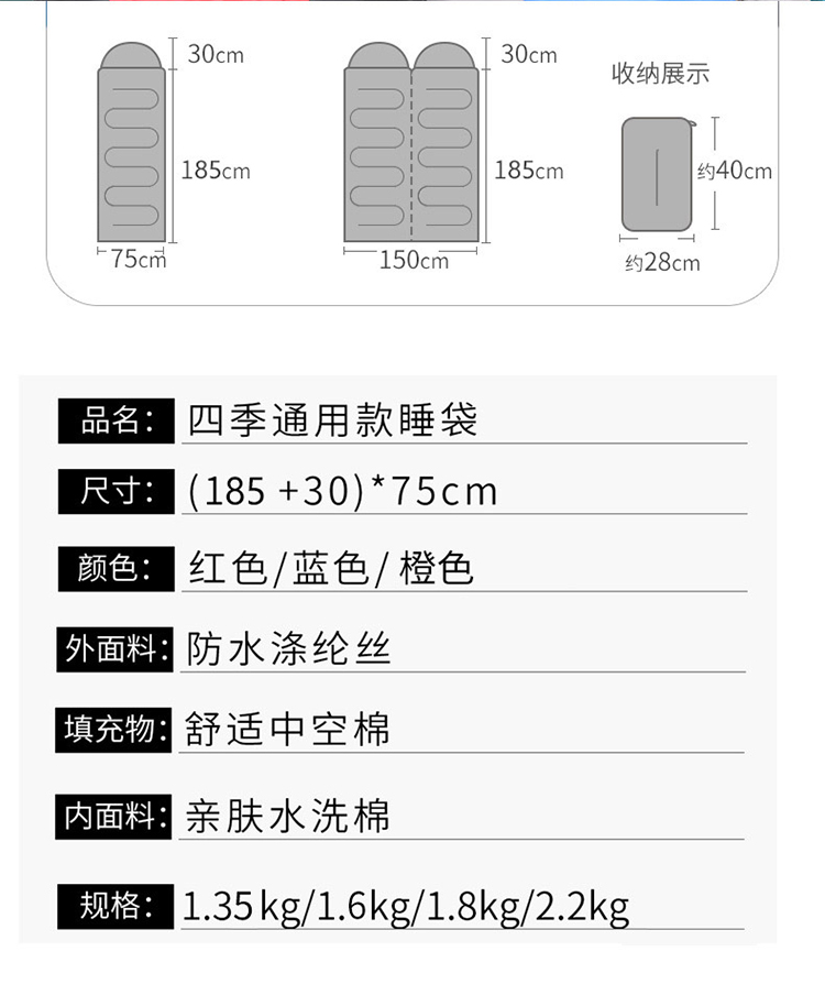 商品名称:三极 TP3002 215*75cm2.2kg 睡袋 红色(单位:条)