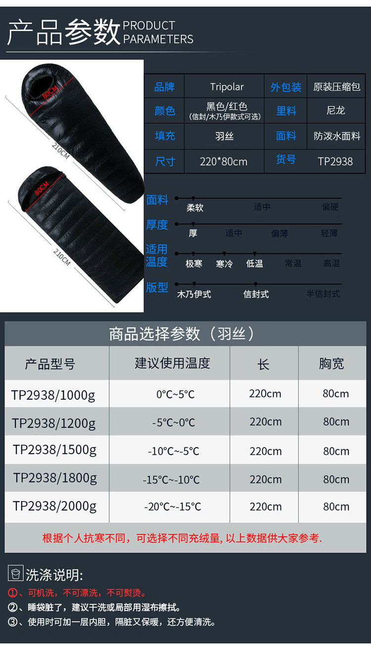 商品名称:三极 TP2938 210*80cm1.5kg 睡袋 红色(单位:条)