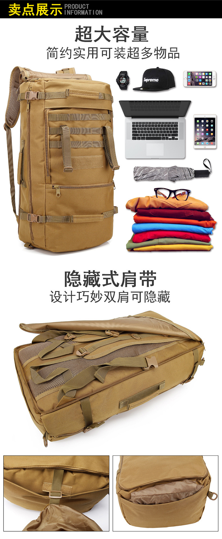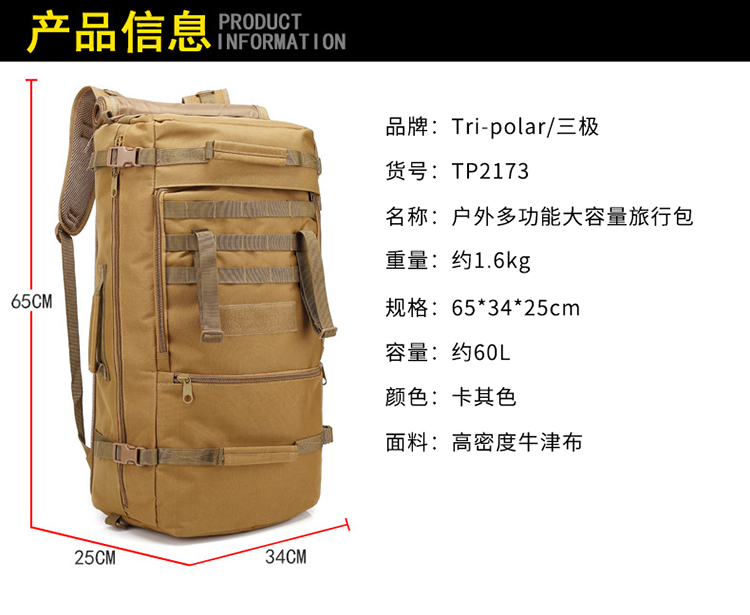 商品名称:三极 TP2173 60L 双肩包 卡其色(单位:个)