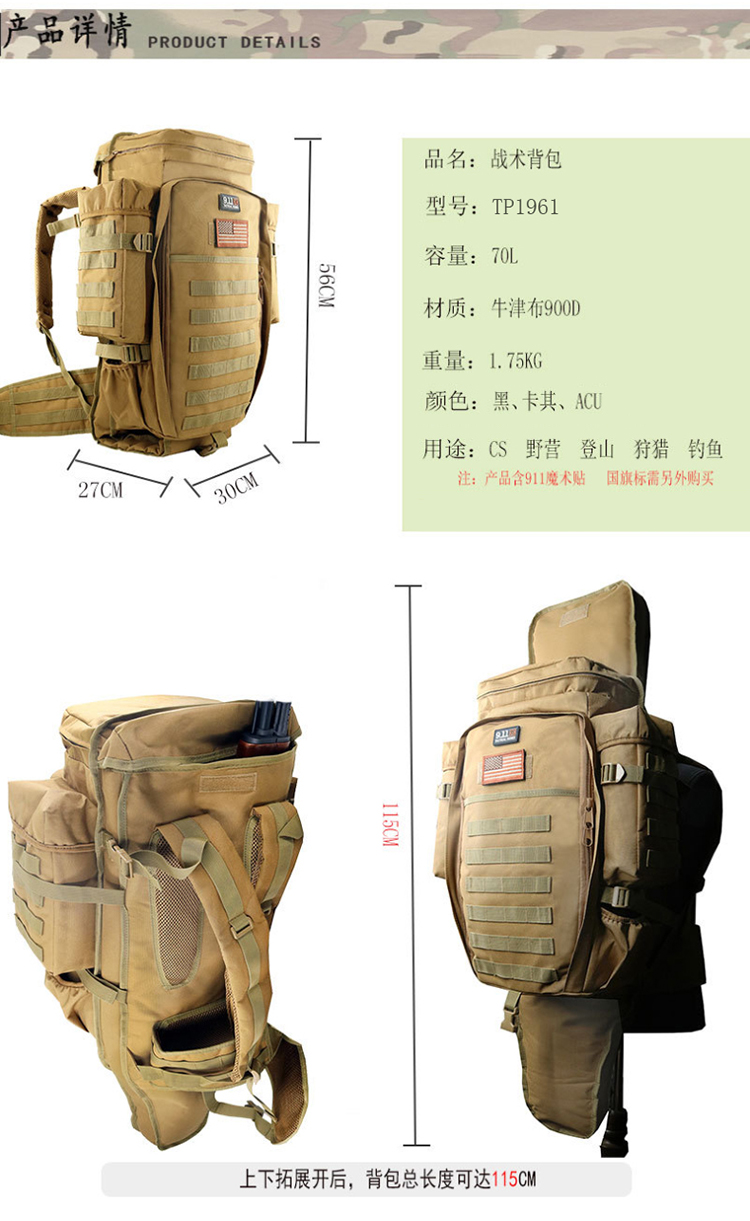商品名称:三极 TP1961 120*30*19cm 双肩包 ACU迷彩色(单位:个)