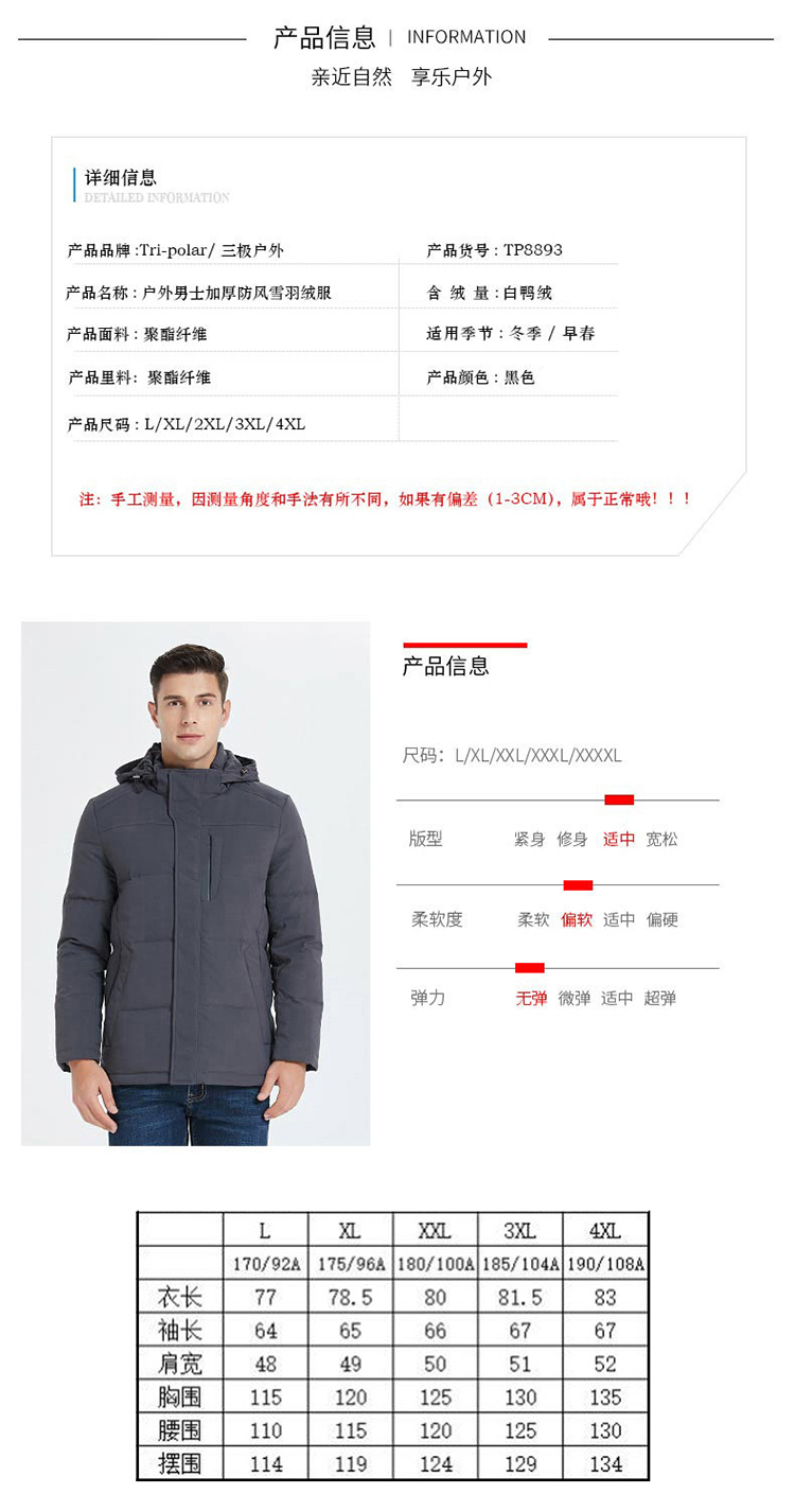 商品名称:三极 TP8893 3XL码 羽绒服 黑色(单位:件)