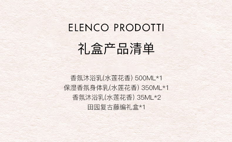 商品名称:东方宝石 YZ0128 东方宝石水润嫩肤沐浴乳(水莲花香)500ml*1/东方宝石保湿香氛身体乳(水莲花香)350ml*1/东方宝石旅行装沐浴乳35ml*2(随机) 藤编洗护滋养礼盒(单位:套)