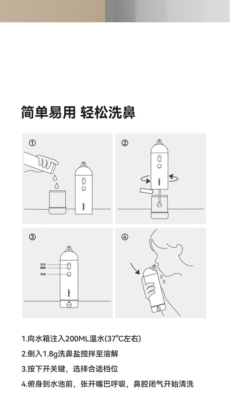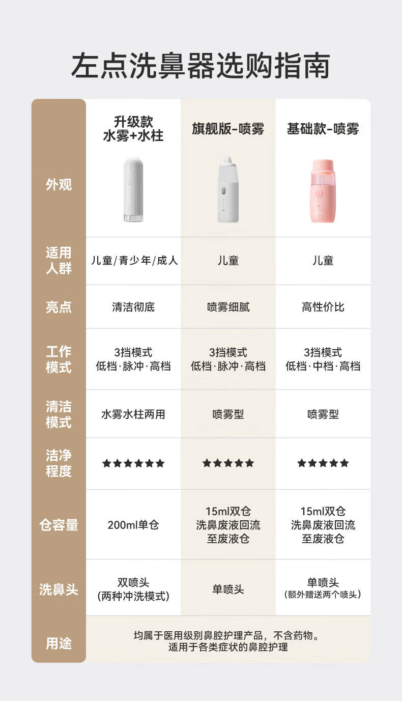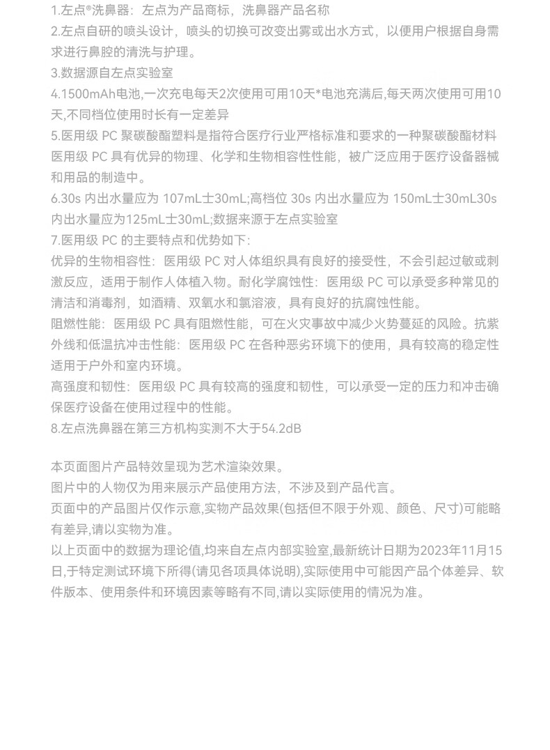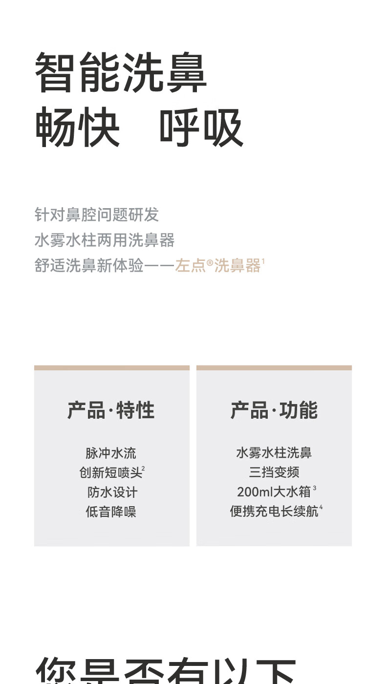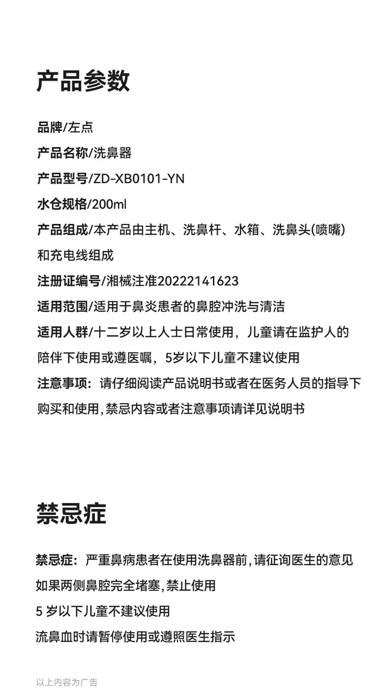 商品名称:左点 ZD-XB0101-YN 本产品由主机、洗鼻杆、水箱、洗鼻头(喷嘴)和充电线组成 洗鼻器(单位:个)