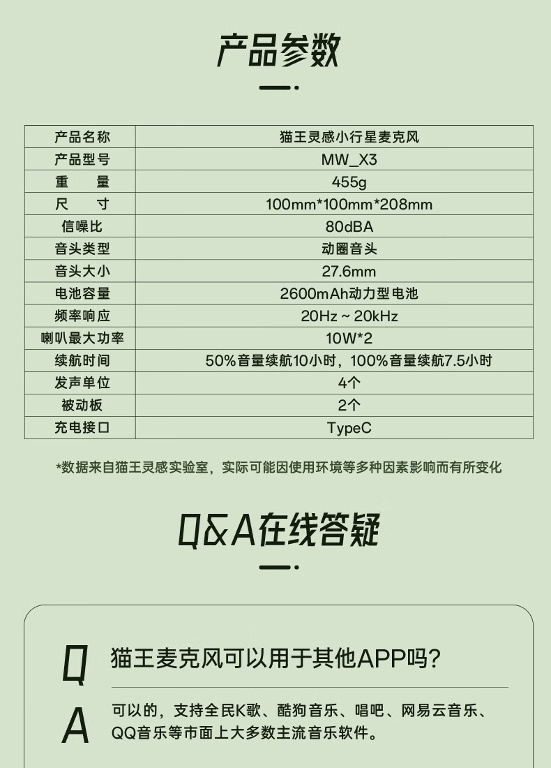 商品名称:猫王 MW-X3幽邃绿 2600mAh 小行星麦克风音响 幽邃绿色(单位:个)