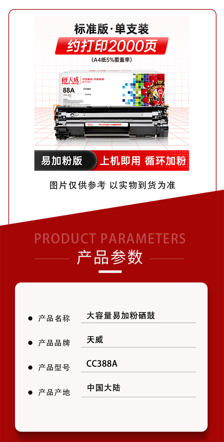 商品名称:天威 CC388A 可打印2000页 大容量易加粉硒鼓 黑色(单位:个)