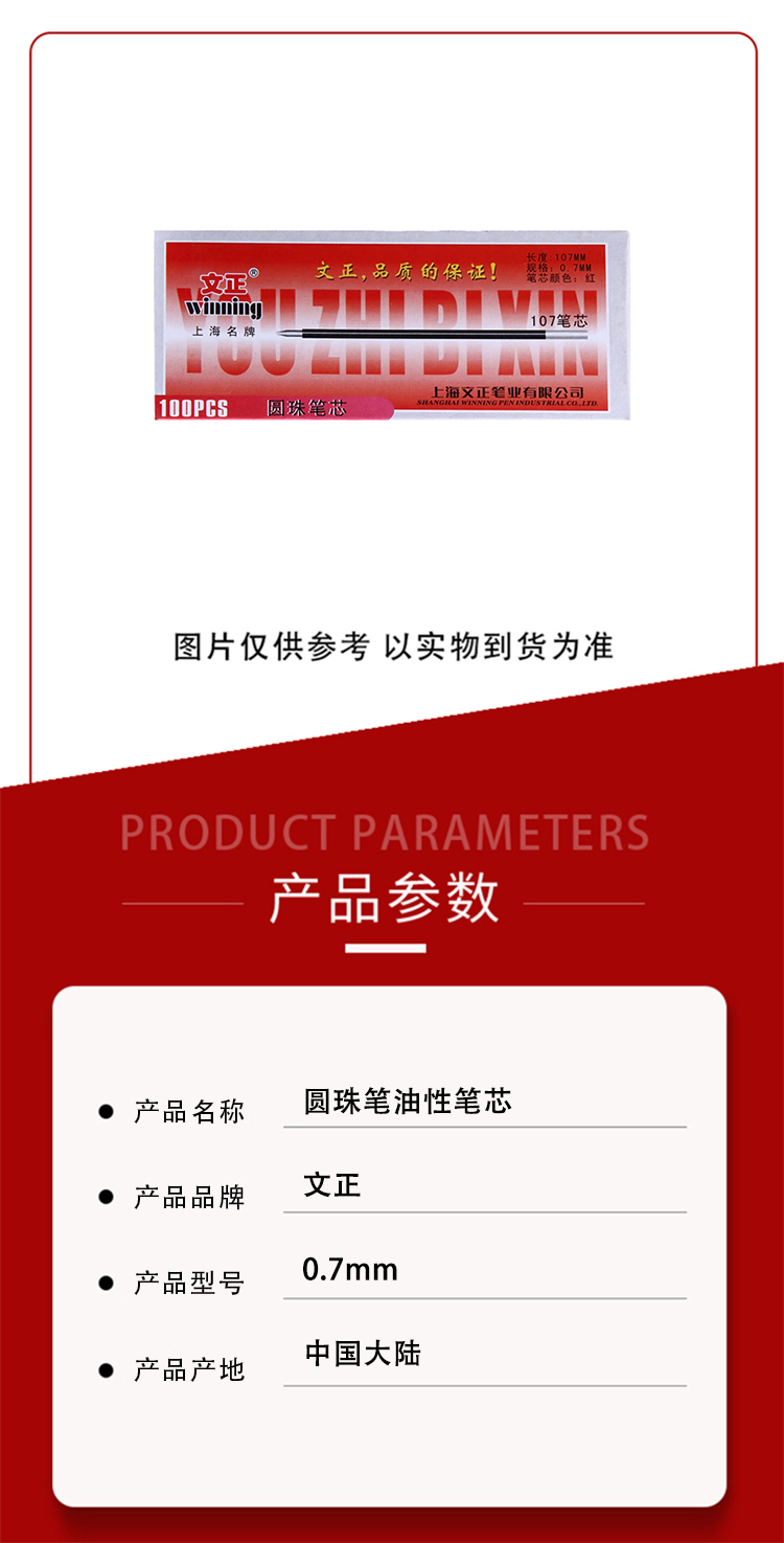 商品名称:文正 0.7mm 100支/盒 圆珠笔油性笔芯 红色(单位:盒)
