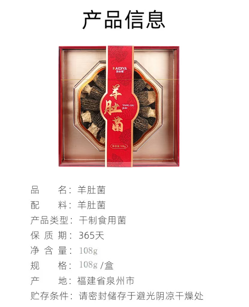 商品名称:凯帝雅 原味 108g 羊肚菌(单位:提)