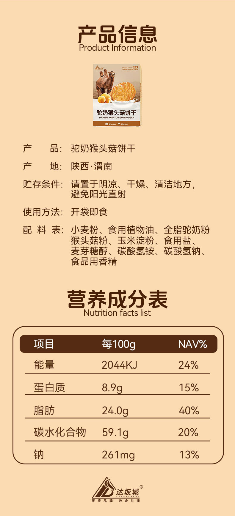 商品名称:达坂城 原味 400G/盒*2盒/组 驼奶猴头菇饼干(单位:组)
