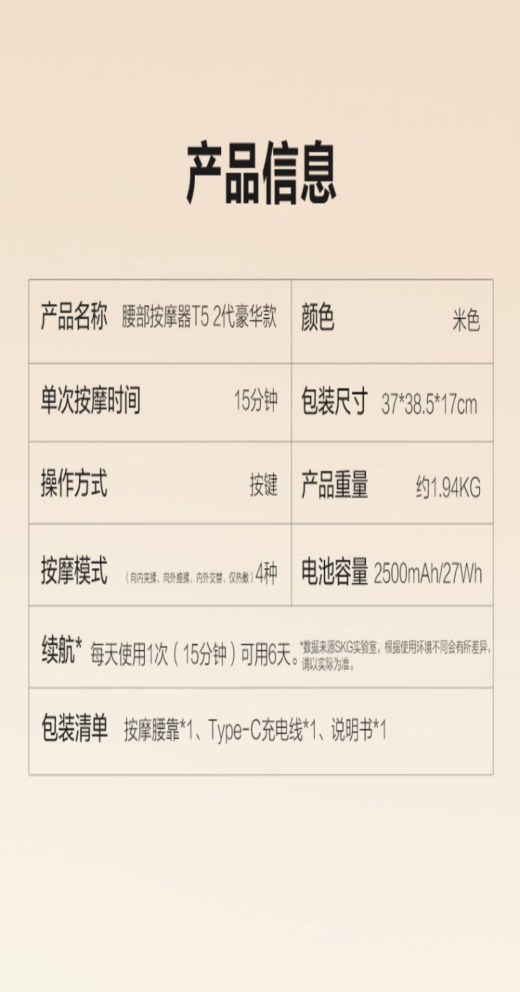 商品名称:SKG T5系列 2代豪华款 腰部按摩仪 米色(单位:台)