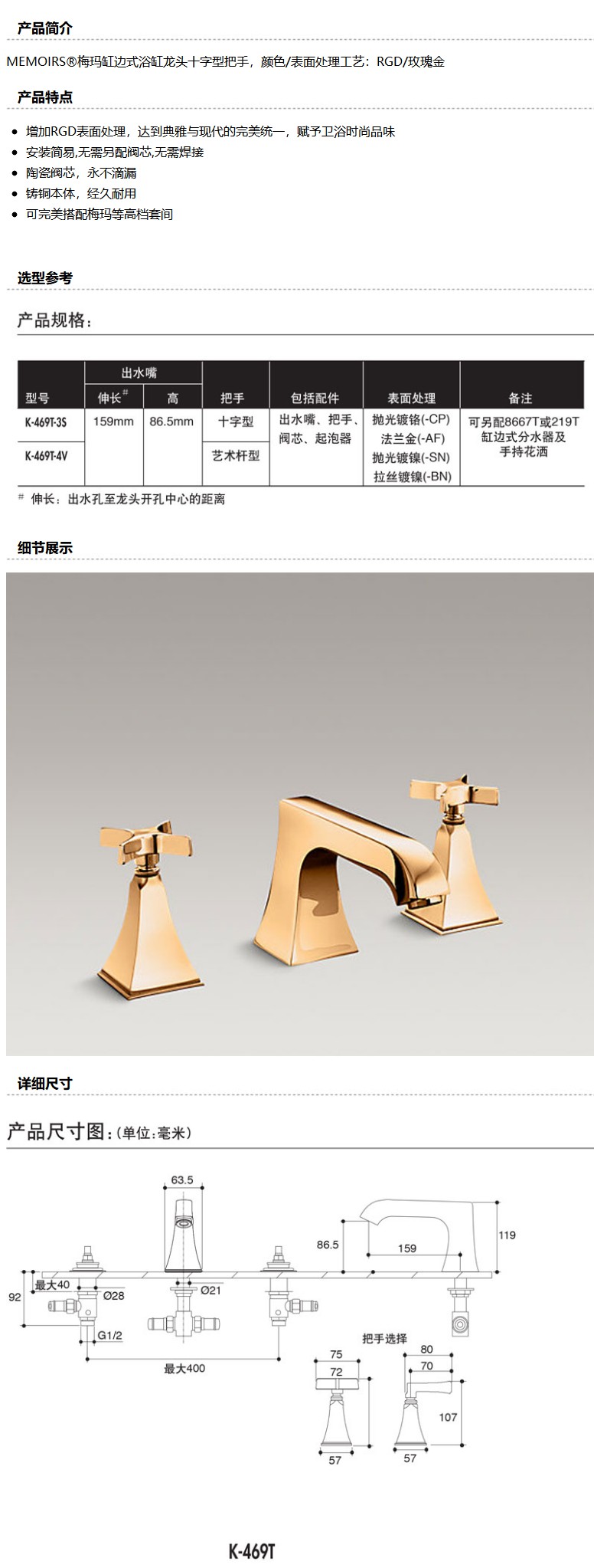 商品名称:科勒 梅玛缸边式浴缸龙头(十字型把手),K-469T-3S-RGD