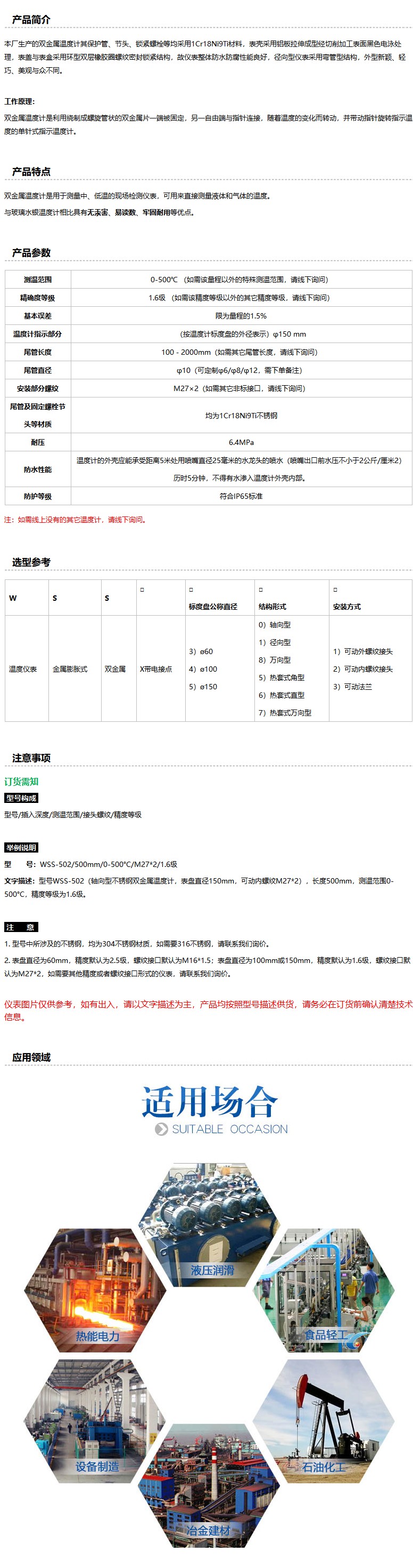 商品名称:上仪 不锈钢双金属温度计,WSS-502 轴向(直型) Φ150 可动内螺纹 M27*2 L=300mm 0-200°C 1.6级