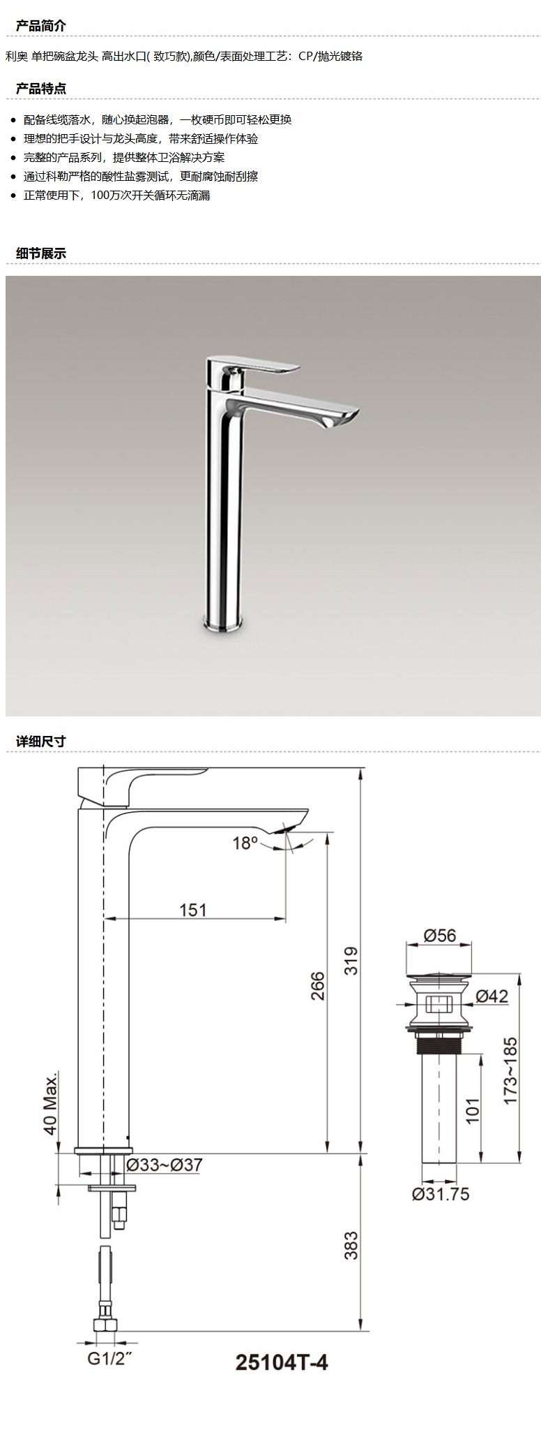 商品名称:科勒 利奥单把碗盆龙头-高出水口(致巧款),K-25104T-4-CP