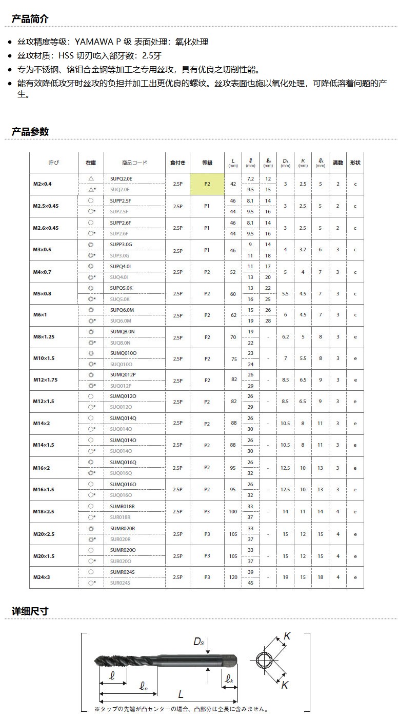 商品名称:YAMAWA 不锈钢用螺旋槽丝锥,SU-SP M16*1.5 P2,适用加工不锈钢、碳钢、铜、合金钢、铸钢等
