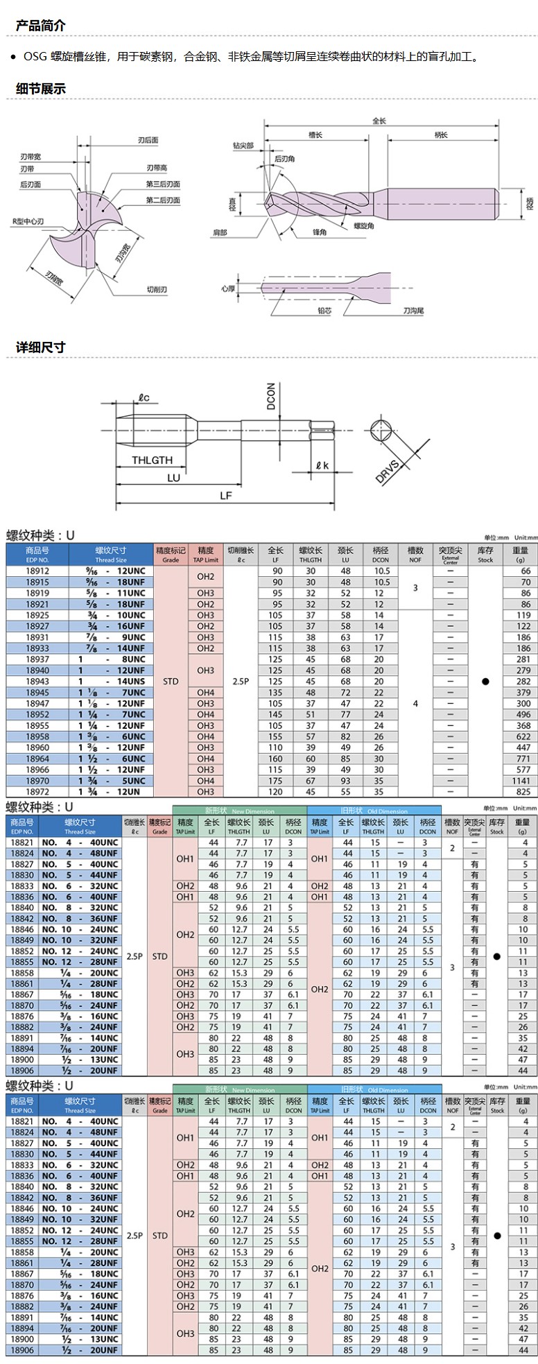 商品名称:OSG 螺旋槽丝锥,EX-SFT 1/2-13UNC OH2,18900