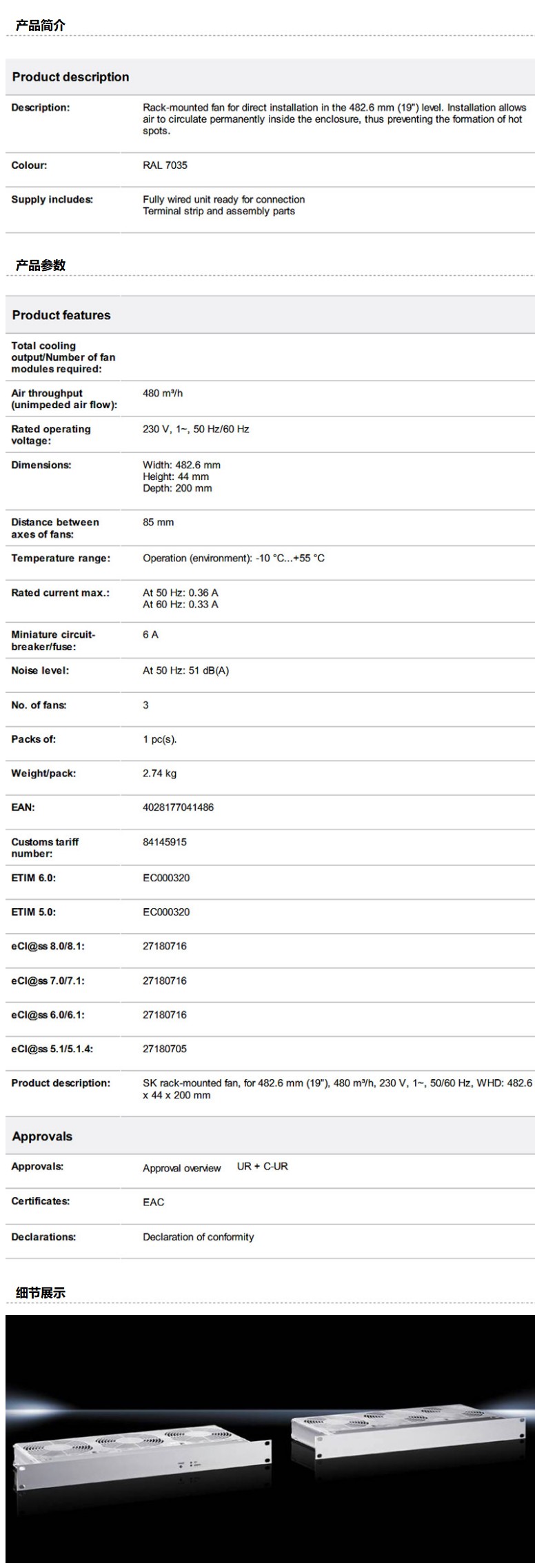 商品名称:威图 机架式风扇,3341.230,用于482.6 mm (19"),480m3/h,230V,含3个风扇