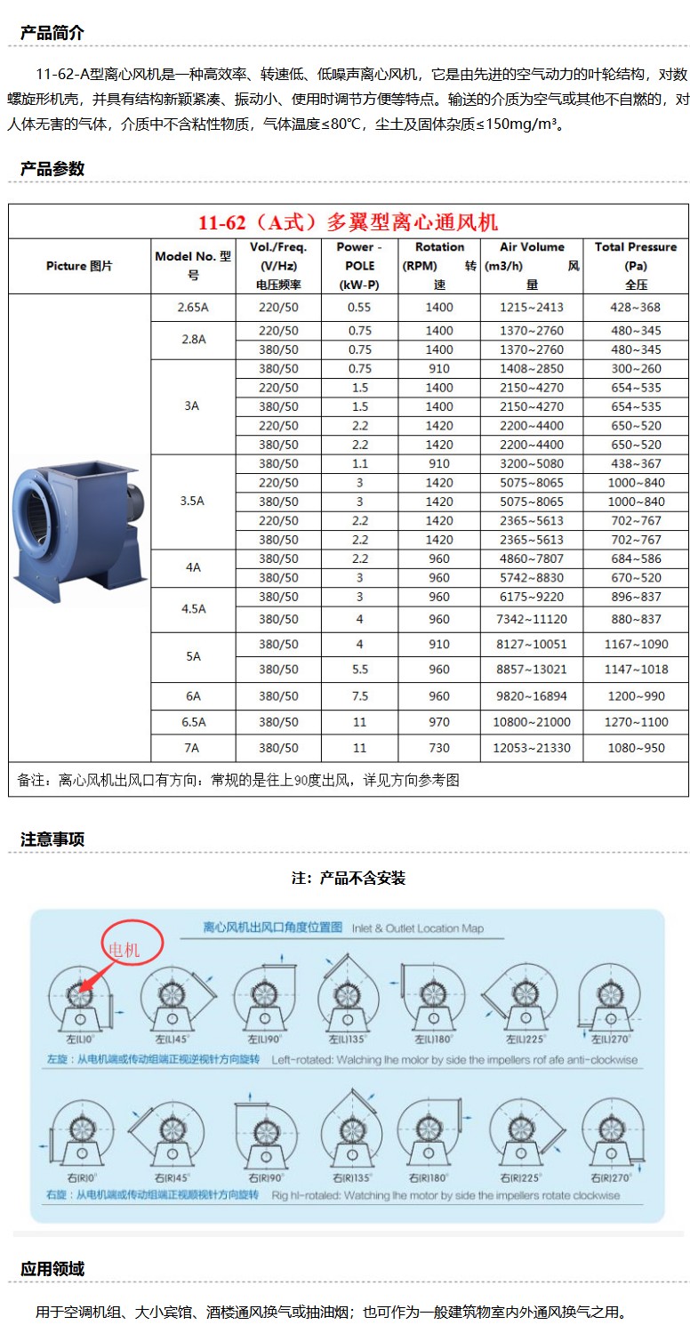 商品名称:九洲普惠 抽油烟多翼式离心风机,11-62-7A,11KW,380V,左旋0°。含木架包装