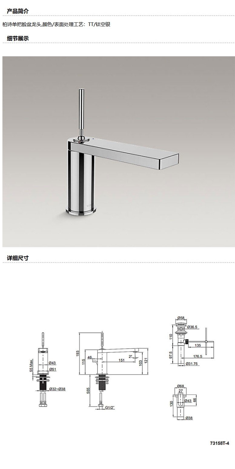 商品名称:科勒 柏诗单把脸盆龙头,K-73158T-4-TT