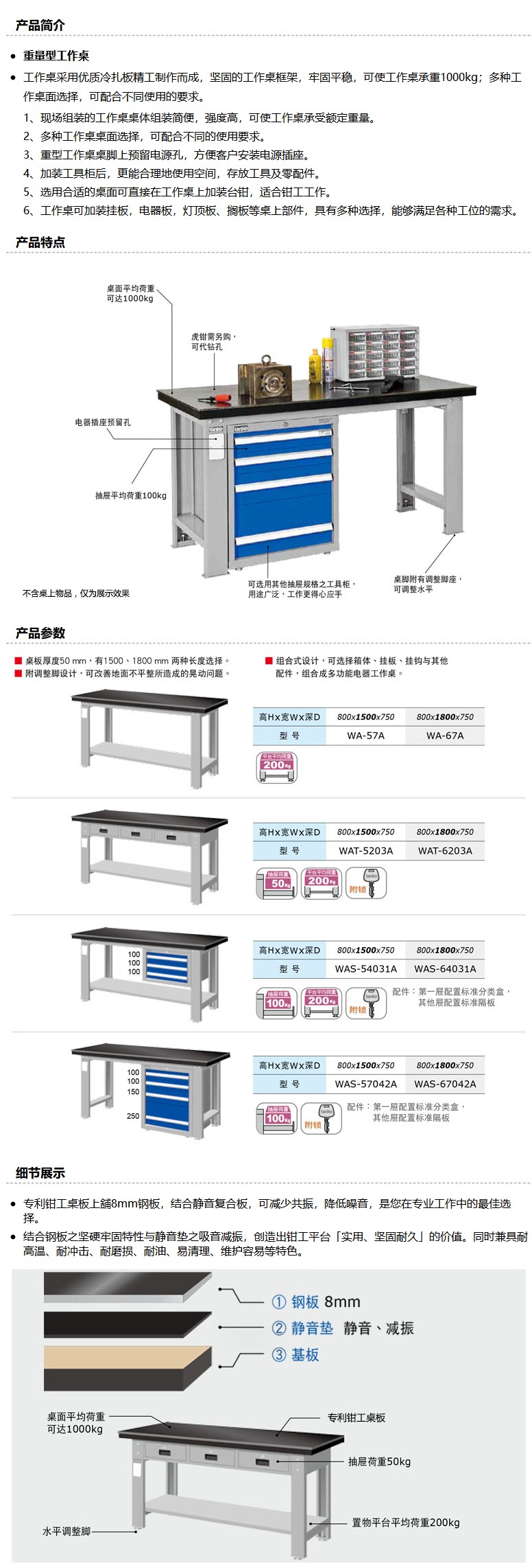 商品名称:天钢 钳工工作桌,高H*宽W*深D:800*1500*750mm,桌面:8MM钢板+静音垫+基板,1000kg,不含安装