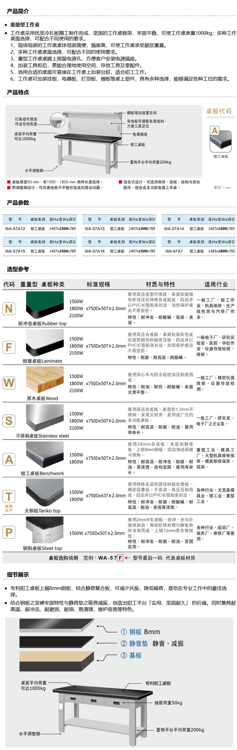 商品名称:天钢 钳工桌板重量型工作桌,宽深高(mm):1407*1500*785 承重(kg):1000,WA-57A13 不含安装费