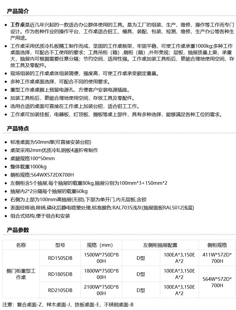 商品名称:锐德 50mm不锈钢桌面双侧6抽1门柜重型工作桌,1500W*750D*800H 载重:1000kg,RD1505DB 不含安装费