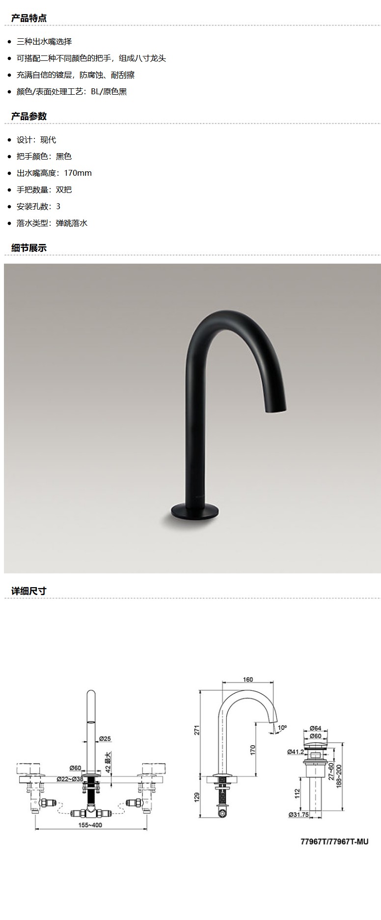商品名称:科勒 艺廷8寸脸盆龙头-曲管型出水嘴(曼联限量款),K-77967T-MU-BL