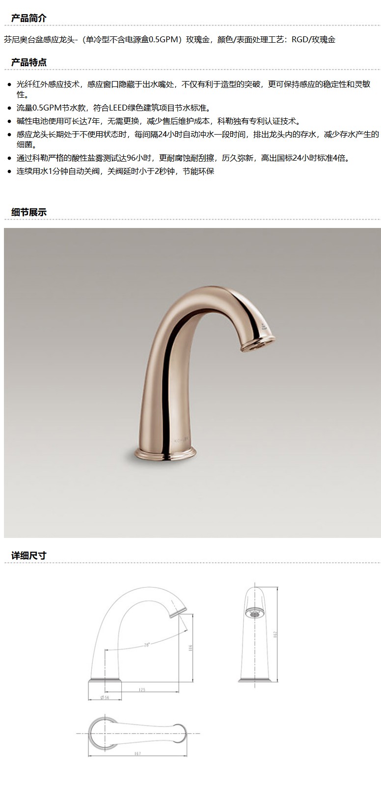 商品名称:科勒 芬尼奥台盆感应龙头(单冷型不含电源盒 0.5GPM)玫瑰金,K-20012T-RGD