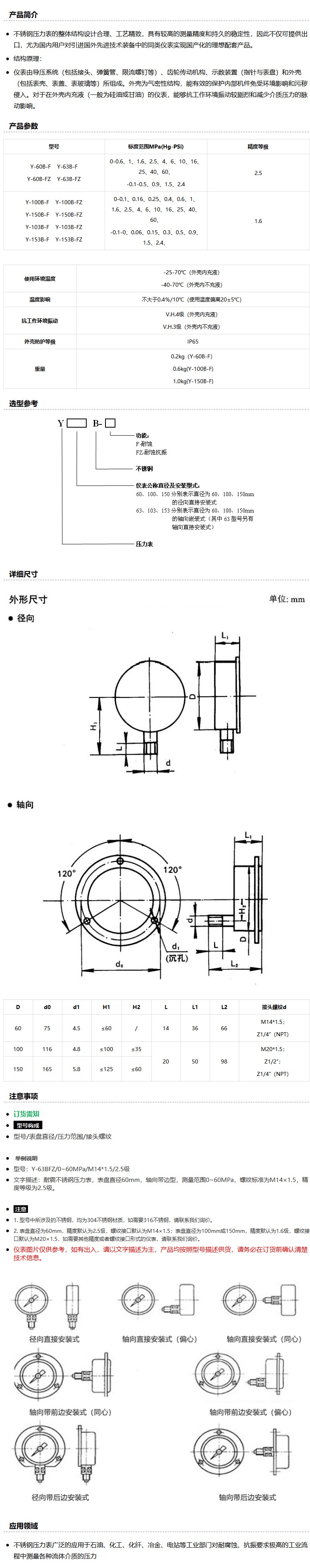 商品名称:上仪 耐震压力表Y-63BFZ,304不锈钢+304不锈钢,轴向前带边,Φ60,0~0.25MPa,M14*1.5,硅油