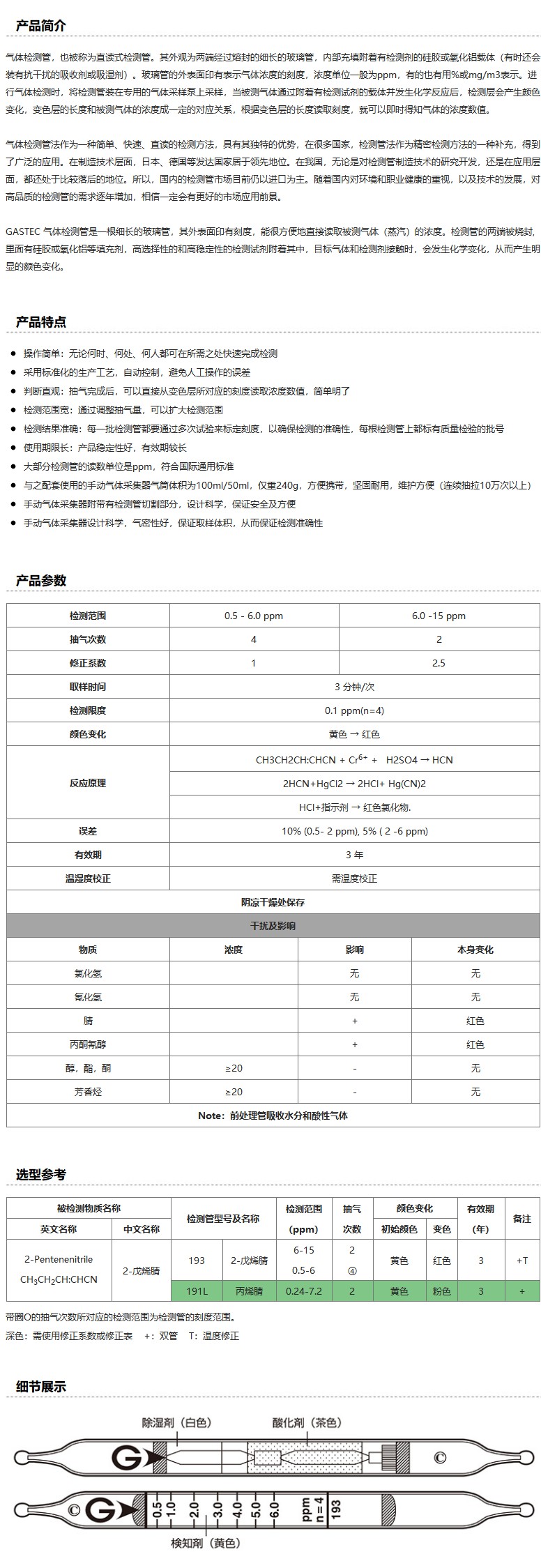 商品名称:日本科思特/Gastec 2-戊烯腈检测管,193,10支/盒 1盒起订