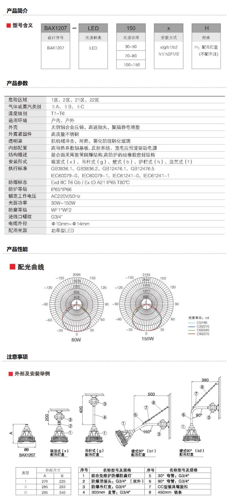 商品名称:上海宝临 LED防爆灯BAX1207,60W 白光5700K 吊杆式 含0.3米吊杆G3/4" 含防爆吊灯盒,单位:个
