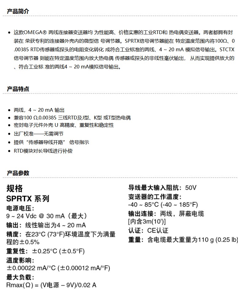 商品名称:OMEGA 连接器式变送器,SPRTX-S2 用于RTD 2~569°C(36~1056°F) 标准尺寸连接器