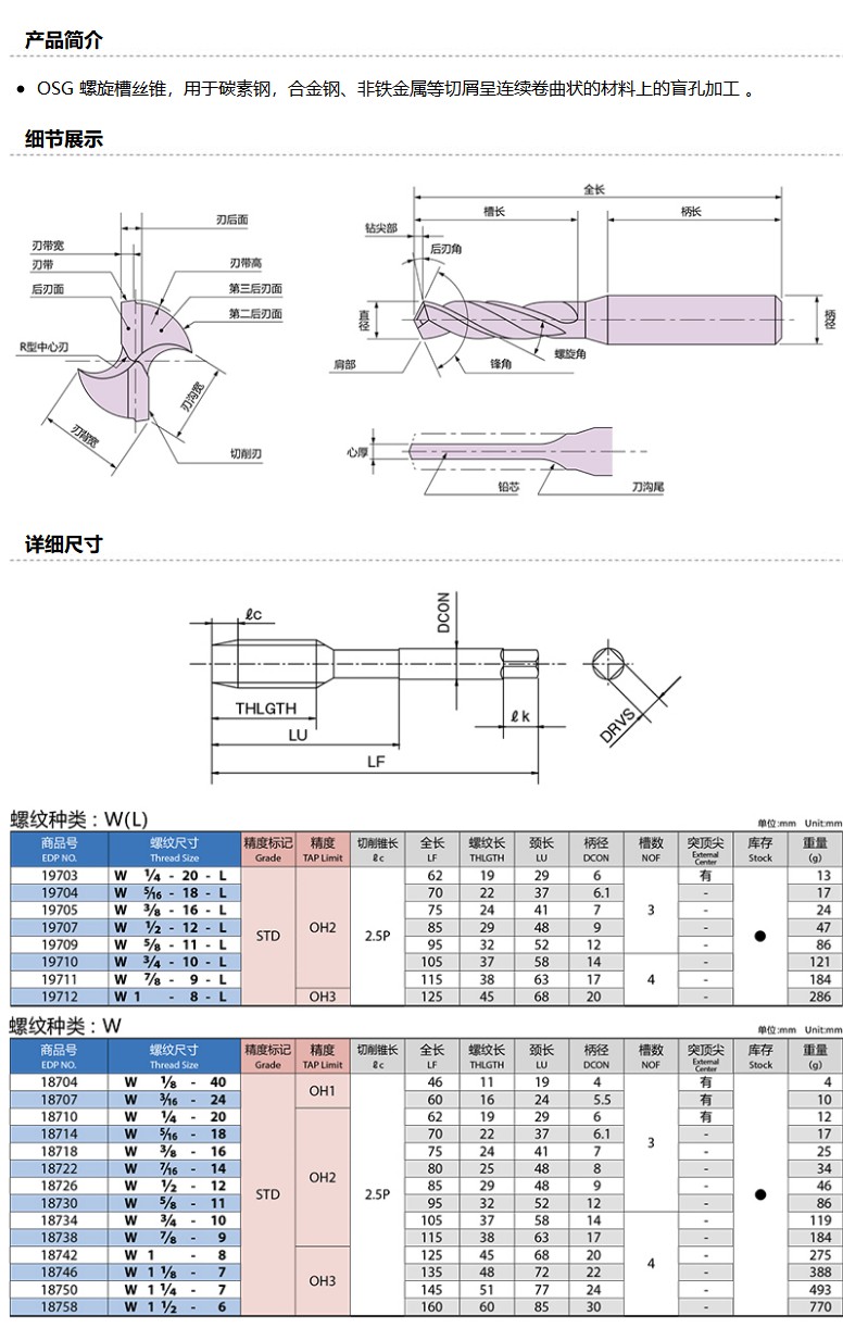 商品名称:OSG 螺旋槽丝锥,EX-SFT W5/8-11-L OH2,19709