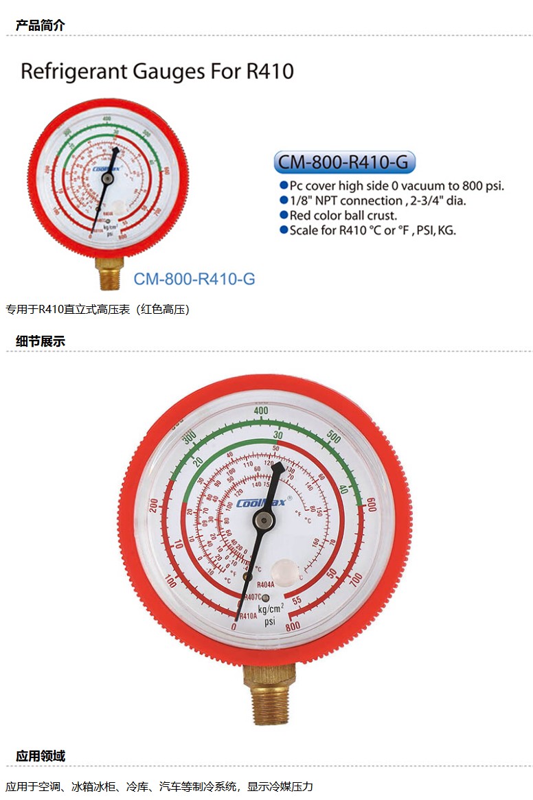 商品名称:格美 直立式高压表,CM-800-R410-G,R410