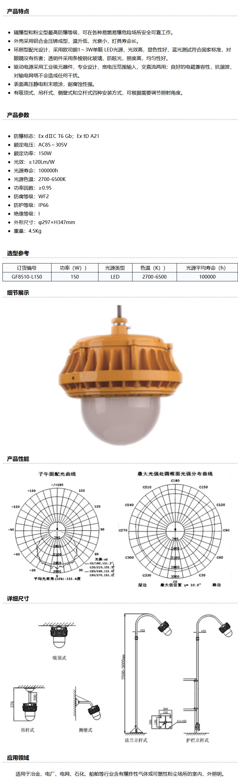 商品名称:源本技术 LED防爆平台灯,150W,白光,GF8510-150W,吊杆安装(含吸盘,0.3米直吊杆),单位:个
