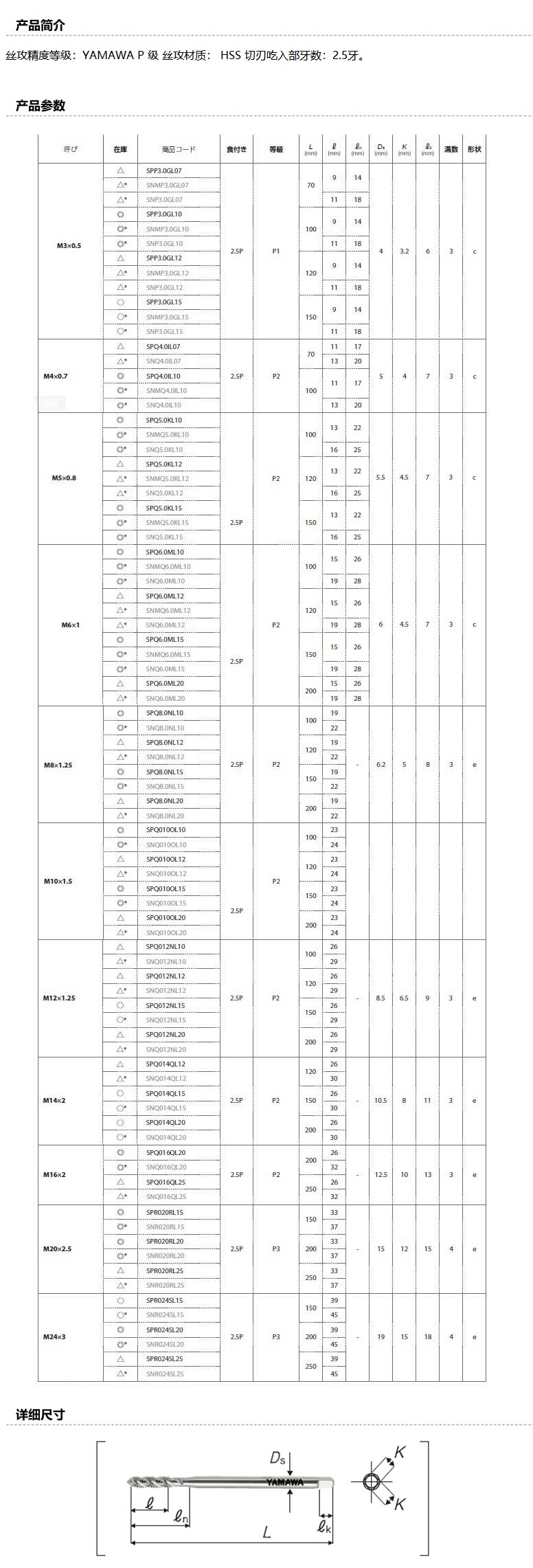 商品名称:YAMAWA 长柄螺旋丝锥,LS-SP M16(M16*2) P2,适用加工低碳钢、铜、铝、镁合金等
